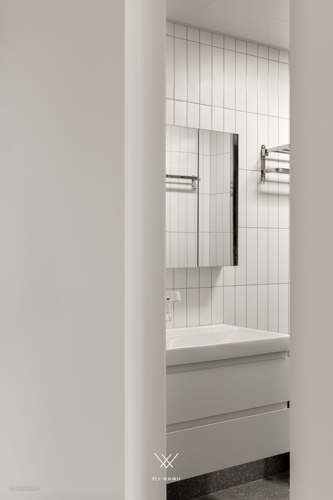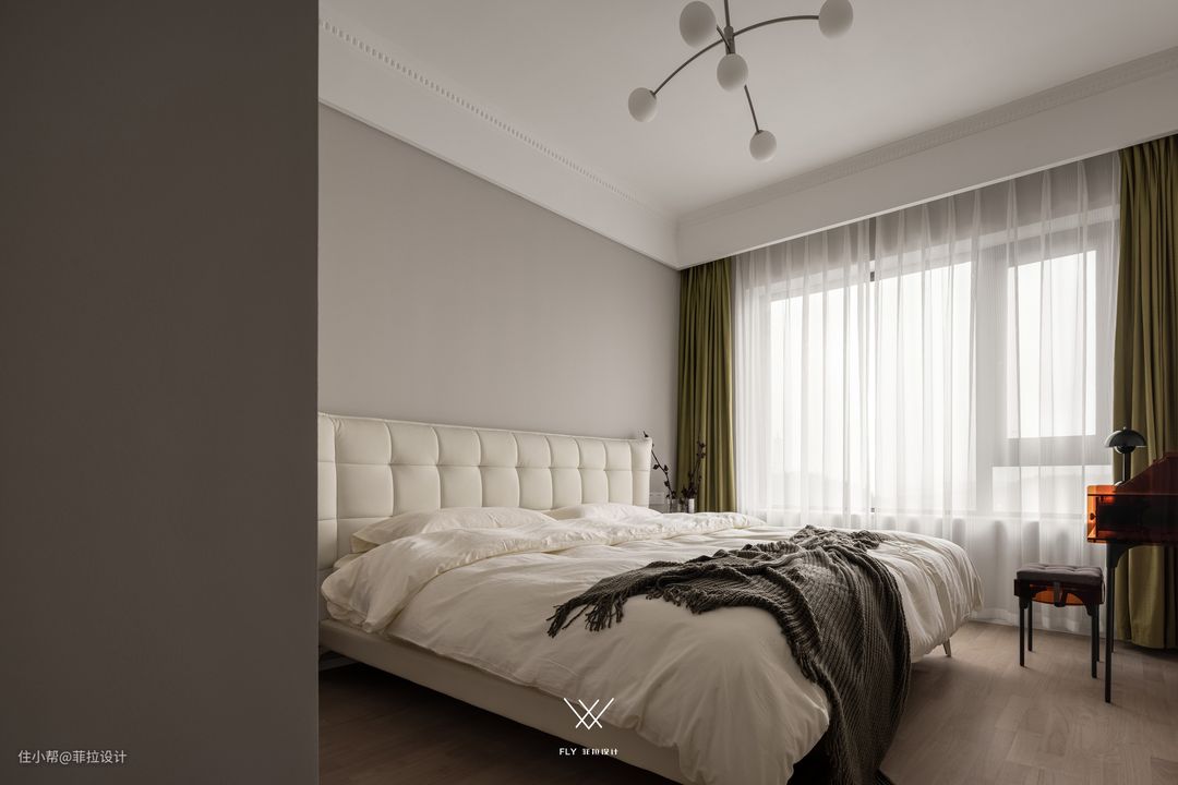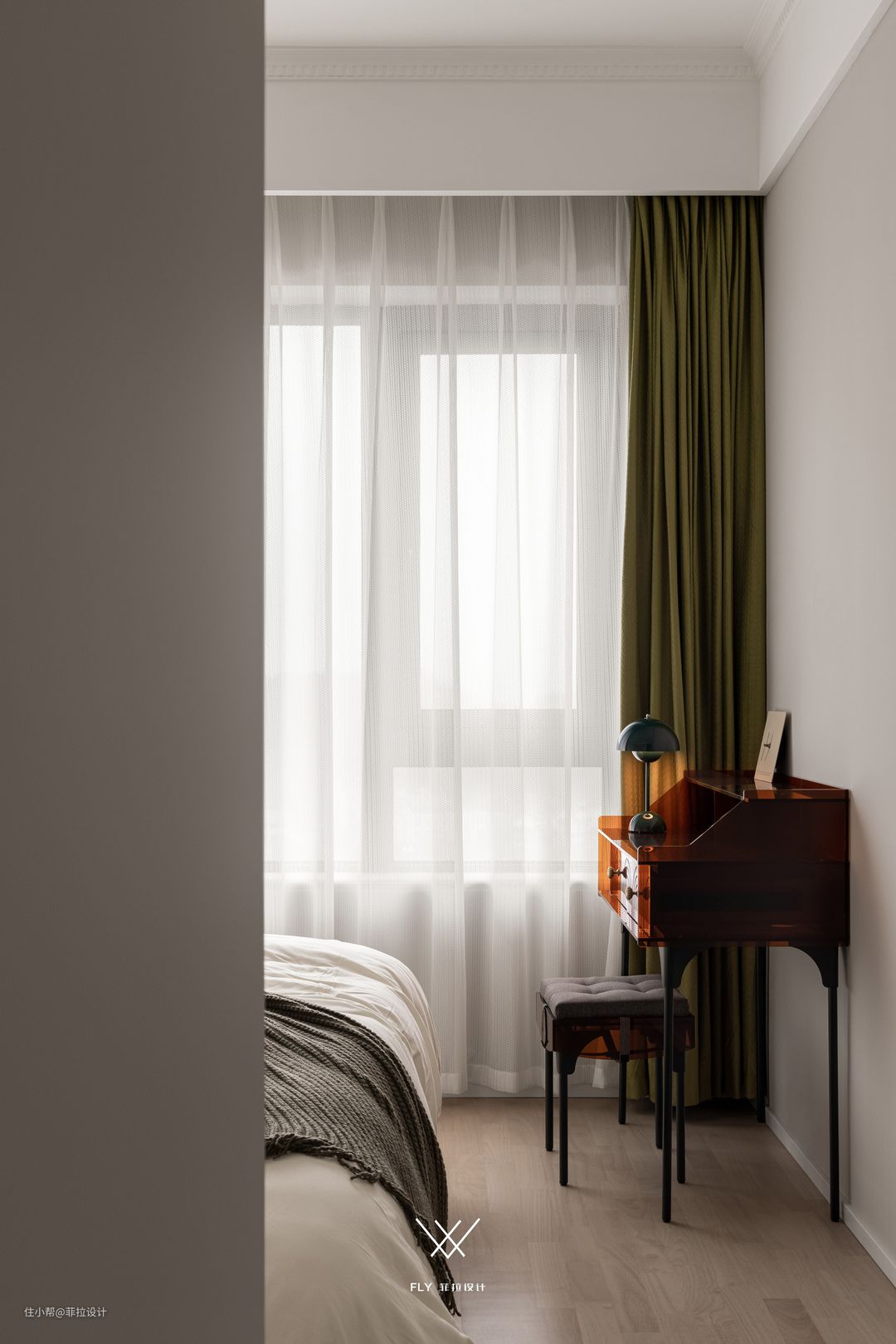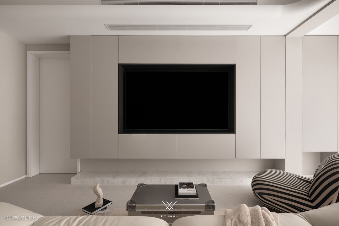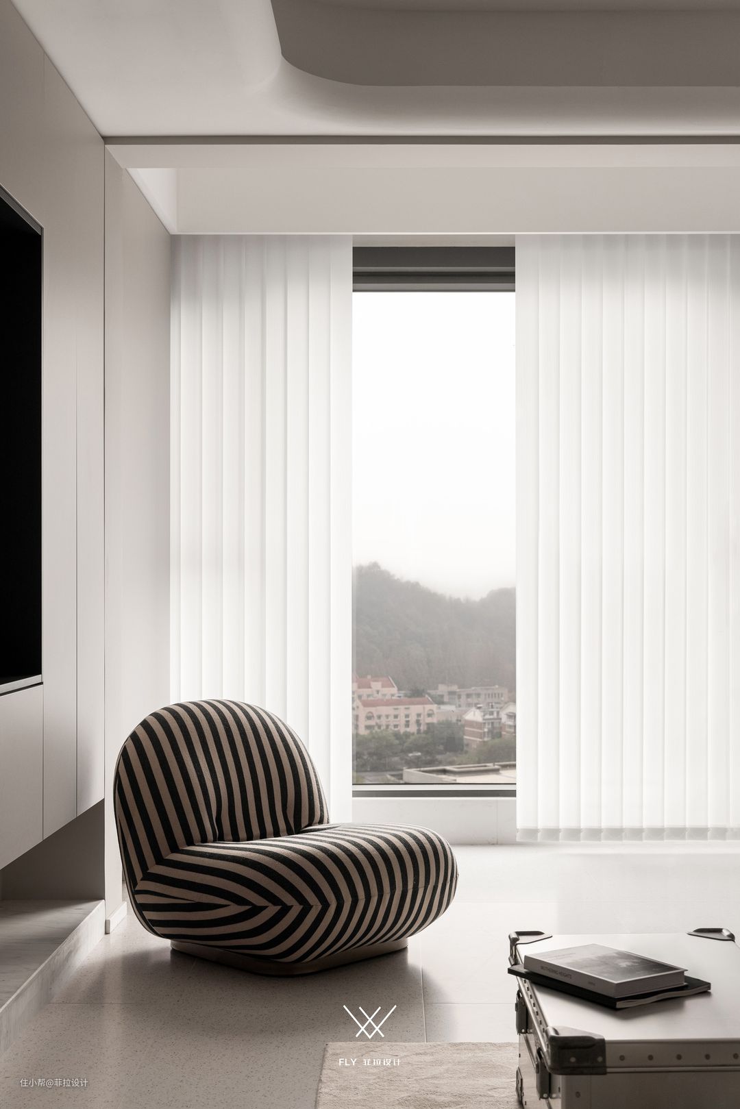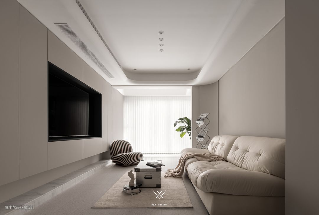因为是刚需房,对于面积来说肯定是希望尽可能地都给充分利用起来,所以我们把朝南的所有阳台都包了进来,邻着客厅的阳台自然被纳入客厅,让原本看着略显局促的公共空间瞬间通透、敞亮了起来,深化了南北通透的效果。 阳台包入客厅之后,还是有承重墙存在,卡在客厅与阳台之间,为了加强视觉美感,希望改造后的阳台与客厅之间是融洽一体的,我们在右侧沙发背景墙邻着的阳台承重墙位置,做了一个曲面的衔接造型,既有着线条本身的柔软美感,又让阳台和客厅之间的融合更自然。在顶面对于风口,还有整个顶面的造型我们也做了处理,打造每一个面的细节,都为呈现最好的空间氛围。 刚需的家,再加上有了小宝宝,对收纳的高需求是无需多言的。我们在电视背景墙这块做的是一整面收纳柜体,中间留白一部分做电视的内嵌处理,柜体的下面不接地,悬浮状的处理既满足了高收纳的需求,又尽量不让客厅的面积看着被压缩,让家里面尽量呈现空间的轻盈感。 从主卧门看向客厅,可以看到最左边电视墙柜体没有全封闭,做了一个侧边格口柜,这个小细节可别小看它,既有弱化大面积柜体膨胀的效果,客厅也有了他们喜欢的物件摆放展示的空间。 窗帘选择的款很是简单大方,是公共空间一个很好的背景——干净、纯粹,有节律感,和室外景色的搭配呈现也很有意境。 从主卧门看向客餐厅角度,在餐厅一侧靠墙位置做了一组餐边柜,与客厅相接,增强空间收纳。