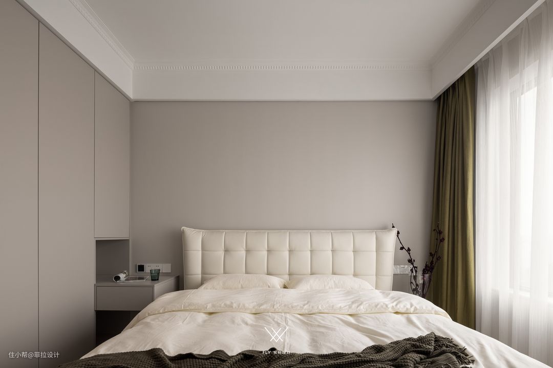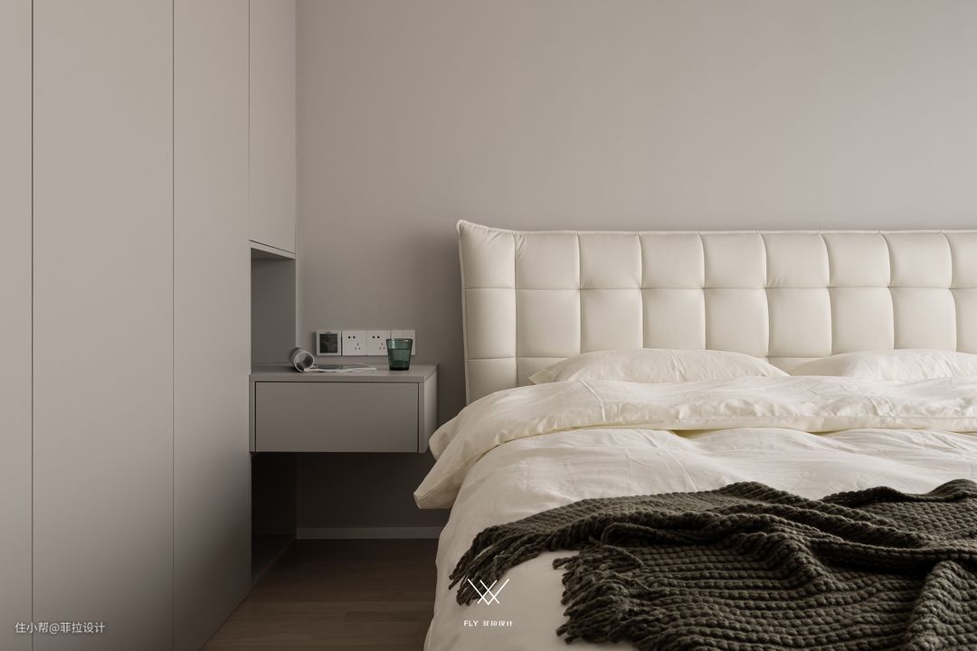 原来主卧的面积比较小,我们把阳台包进来之后,主卧的空间才算是有一个比较舒适的状态,一张宽敞舒适的床、床头柜的空间、一整面衣柜的空间都得到了妥善的安排。 左侧床头柜我们做的是与柜体穿插的结构形式,悬浮状在视觉上不占空间,希望卧室可以多一些轻盈感,平衡好生活中的功能需求与舒适感。