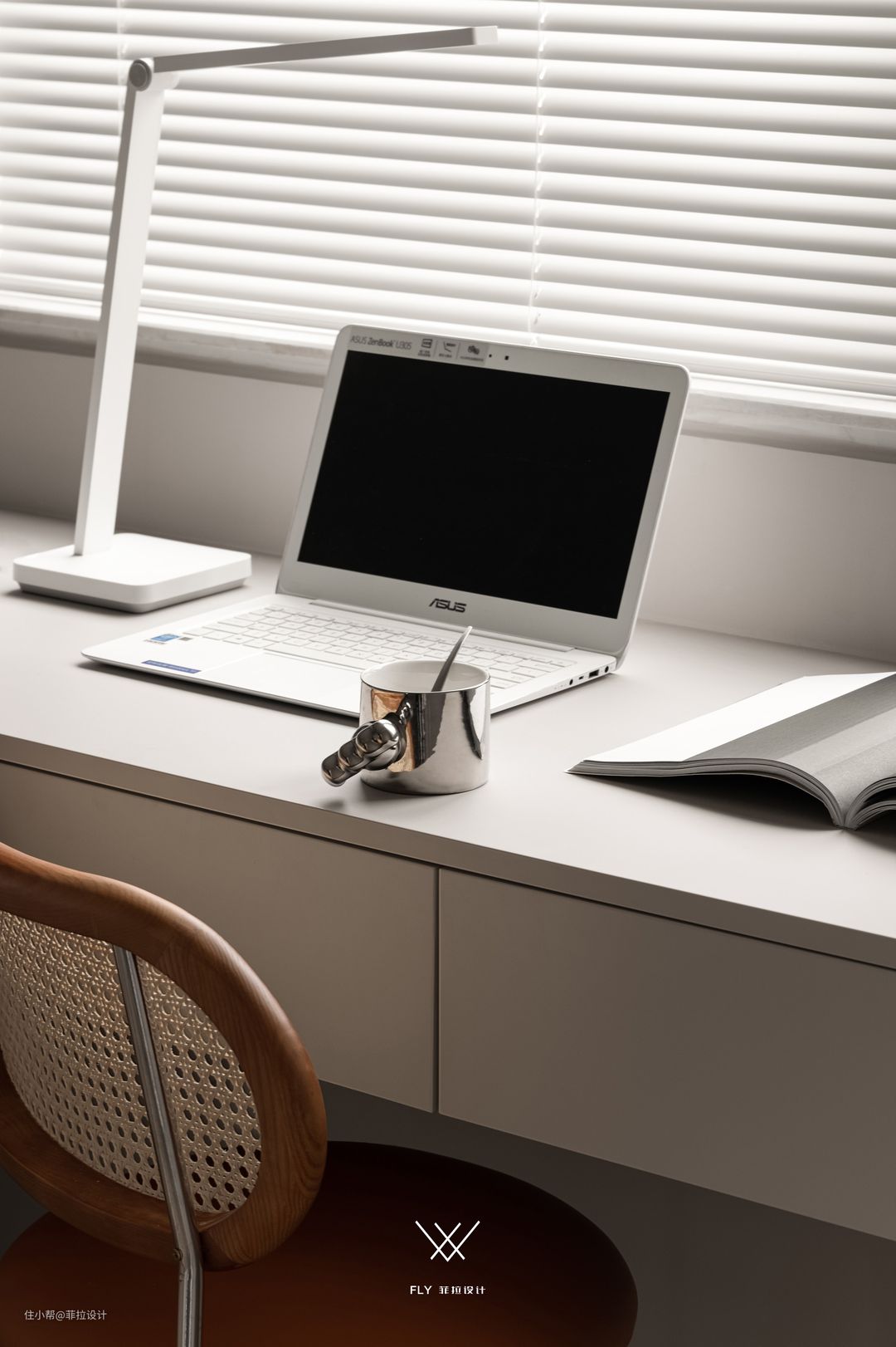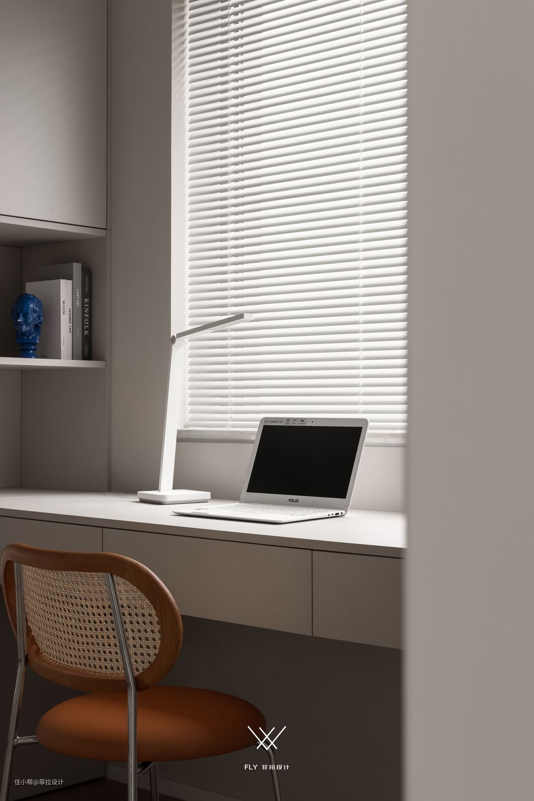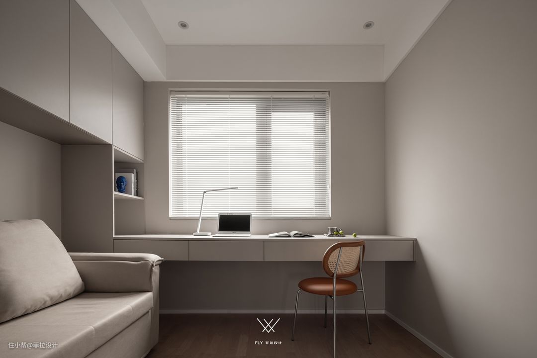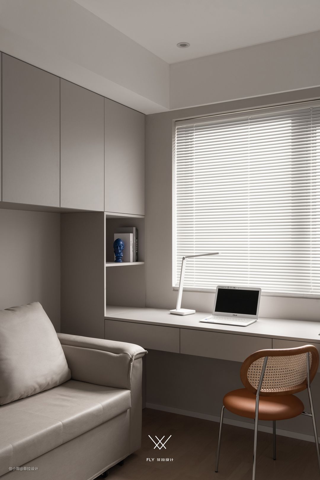 说是书房,也是一个多功能房,为了保证南北通透,这个房间平日里就作为书房使用,房门做的是玻璃移门,平日里就打开,让整个公共空间从南到北 光与气在自然流动。 这个空间里还放了一张沙发床,有亲友客人来访的话就是临时用房,父母来照顾孩子也有住的地方。 在沙发上面做了一排吊柜,以及书桌也是做的抽屉柜,尽可能地增强每个空间的收纳能力。
