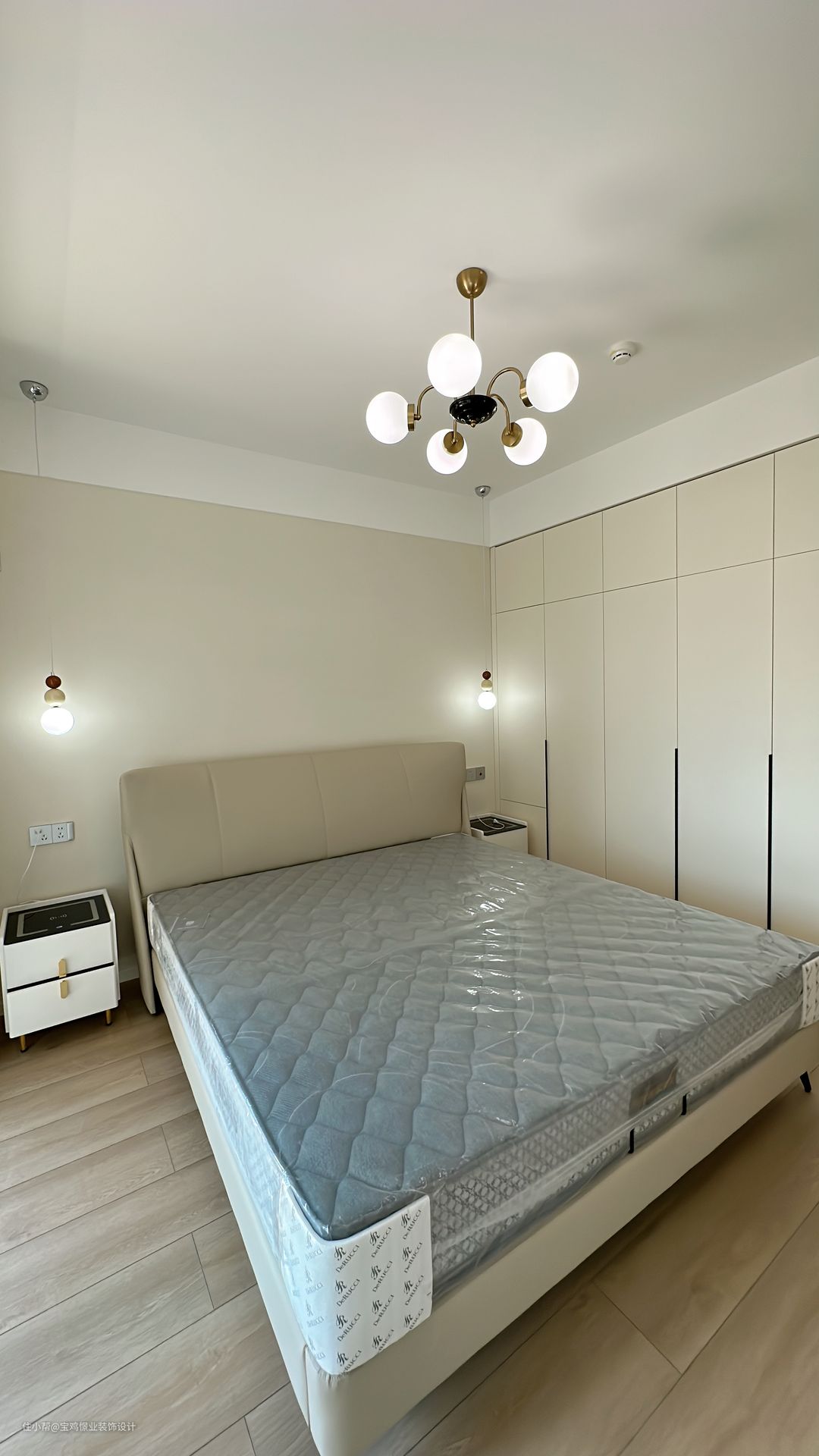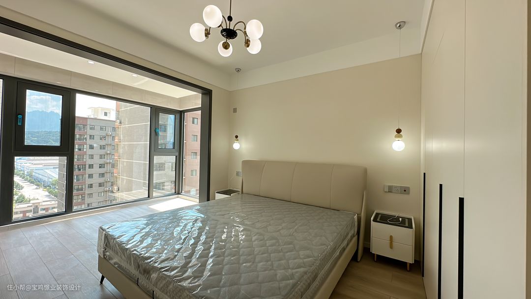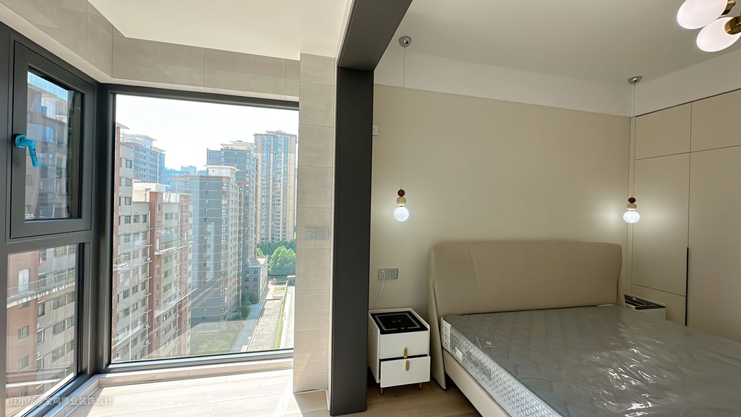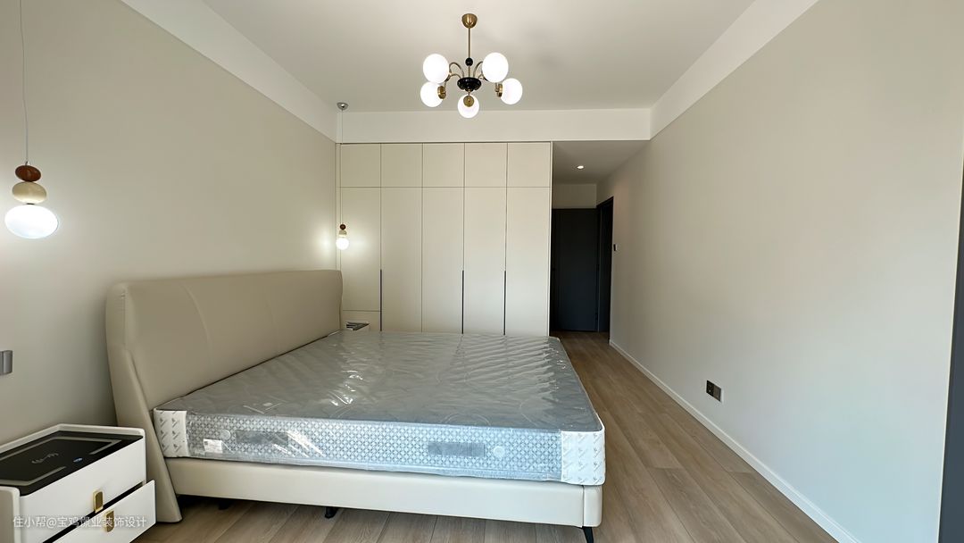 整个主卧色系统一,全屋米白色乳胶漆,不做复杂的造型设计,简约而不单调。吊顶采用主灯设计,氛围感满满。主卧配有一个落地窗阳台,使得空间透光性更好,房间通透明亮。