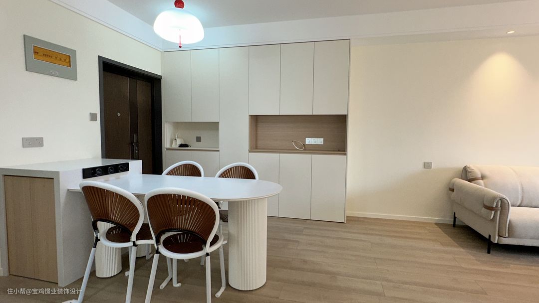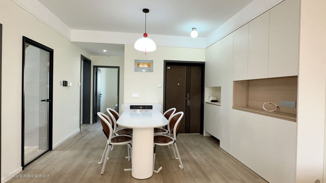 餐厅采用与客厅相同风格,搭配同色系的餐边柜,用木纹板开放格进行点缀,更加的美观。入户柜与餐边柜共用一个,更省空间还美观大气,这个是餐厅的吊顶,看着非常别致,餐桌放下面整个餐厅的氛围感一下就有了。