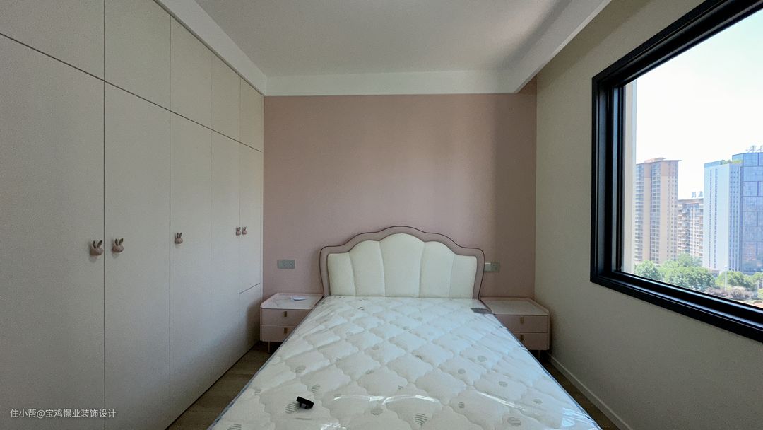两个次卧吊顶使用最简单的单眼皮吊顶,搭配主灯照明,让空间更加的温馨。常规衣柜设计不会出错,满足日常储纳衣服要求。