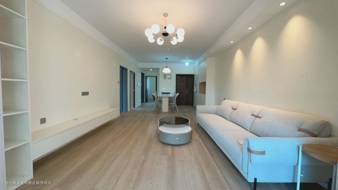 客厅非常通透,大面积米白色墙面搭配同色系护墙板,顶面采用单眼皮吊顶设计,电视背景墙摒弃复杂的造型设计,简单的电视柜组合搭配乳胶漆墙面,地面通铺木地板,让整个空间变得更加的温馨。