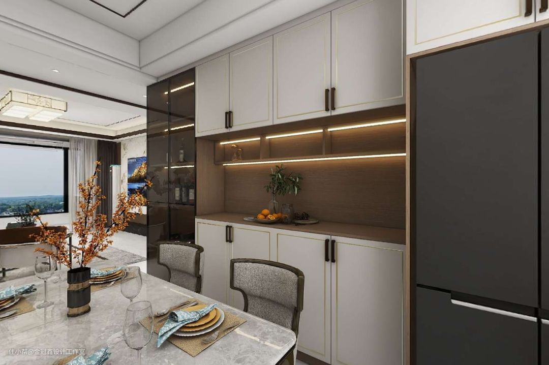 ⭐:将古今中外的设计理念延伸至现代生活。中式韵味的对称设计,融入金属线条带出些许的轻奢感。 典雅的咖色配色,结合中式元素的应用,以现代的设计手法营造简约的东方韵味。 整体线条流畅,排列的错落有致,层次感十足。冰箱嵌入柜体,提高了空间利用率,减少了厨房的负担。