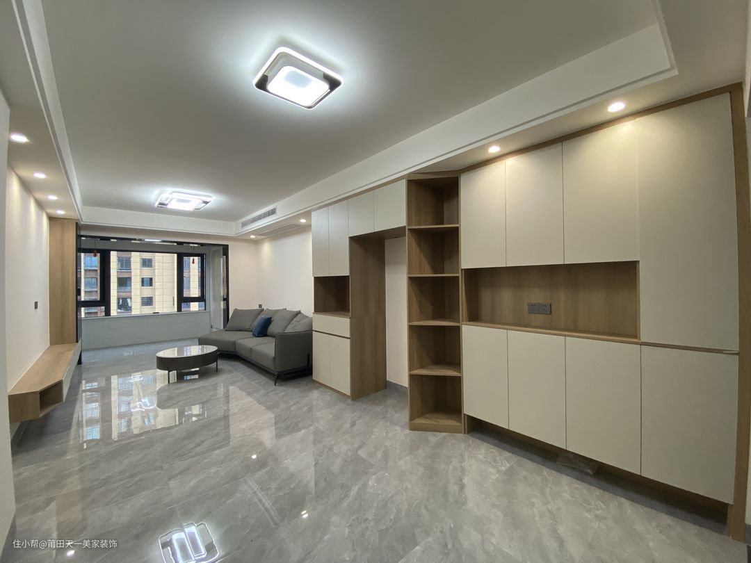 在入户的第一视角,我们便看到了宽敞的玄关空间。设计师延长客厅的边吊设计,在玄关区域也做了边吊筒灯的灯光照明,大大增强了空间的延伸感。在这里还定制了一面餐边柜+玄关柜的组合,同时搭配弧形处理手法,保留电冰箱位置的同时,也让原本的收纳柜空间倍增许多。