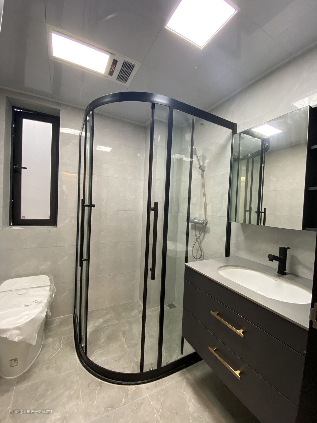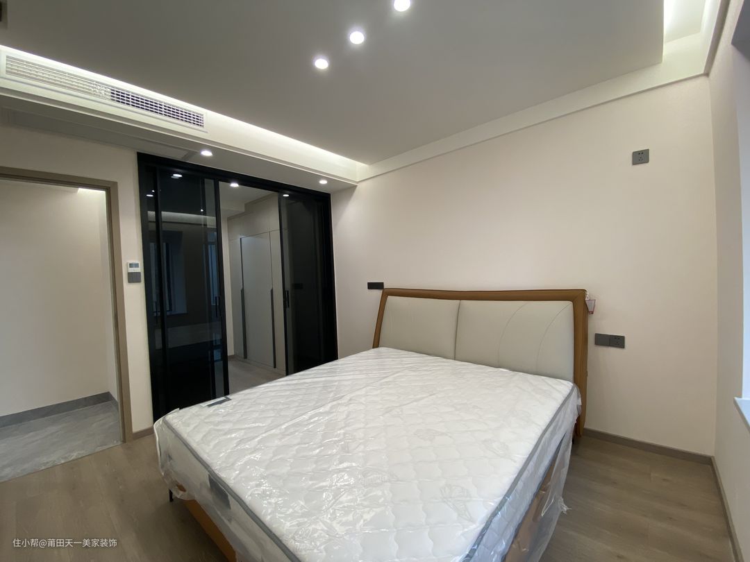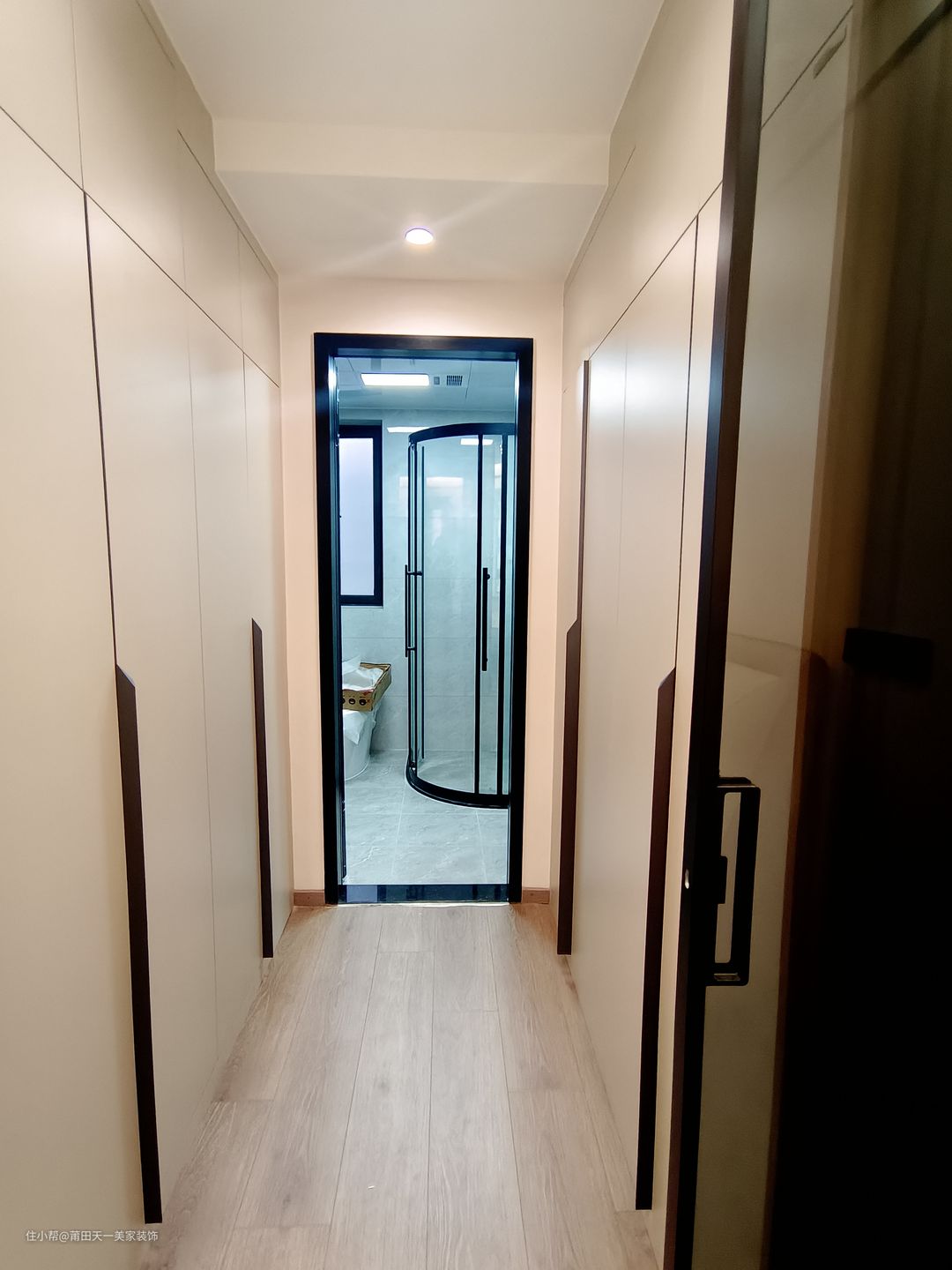 主卧是一个包含了衣帽间,卫生间的综合功能套间,走进门来就给人以“温馨质朴”的感觉,中间一张暖色调的软包床铺,搭配大面积木饰地板给人一种惬意又温暖的氛围感。奶茶色背景墙+质朴的木地板基调延续了整体的简单色系,充斥着没有杂质的美好,赋予空间自由整体性和舒适宁静感。 在休息区与卫浴两个区域之间,设计师在地面做了阶梯处理,既能合理有序地划分不同的区域,又能防止浴室的水渍弄脏睡眠区。接着还根据坡度定制了两面通顶式衣柜+地柜,既合理地满足主人公的衣帽收纳功能,又大大增强了储物空间。 主卫的加入,也让整个主卧的配套更加完整,设计师选用一个弧形浴室门将淋浴区和洗漱区分隔,保证了整体的干净简洁感,还能够有效的减少细菌的增生,以及起到防滑的效果,这对主人公夜起上厕所起到很大的保护作用。