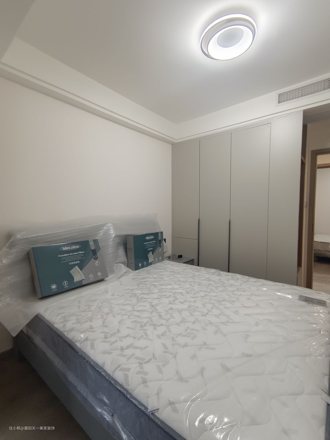次卧采用局部边吊搭配一个别致的吸顶灯,中间放置一些舒适的床品,这样的布局在功能性与装饰性都得以兼顾的情况下,带领着居者抵达疗愈无压的睡眠时光。另一侧衣柜采用通顶式设计,避免了传统柜体带来的厚重感,浅灰色系的搭配更是创造出一种和谐的美学秩序,极大地提升家居格调与生活的仪式感。