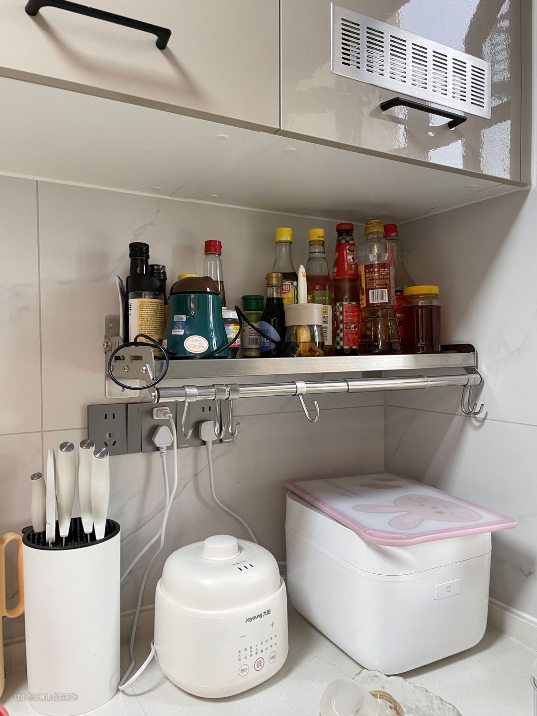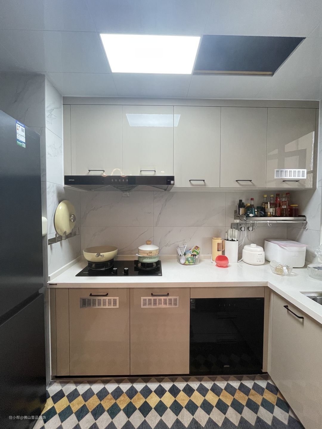 厨房是做了L型的动线布局,灰咖撞色的碳晶面板的橱柜柜门,无把手的设计,直接做到顶防止藏污纳垢,油烟机是直吸形式嵌入到吊顶中,水槽是位于窗台的位置,利用镂空的空间搭配金属的置物架,可以放置调味剂,小家电也有专属的空间,简单又实用。