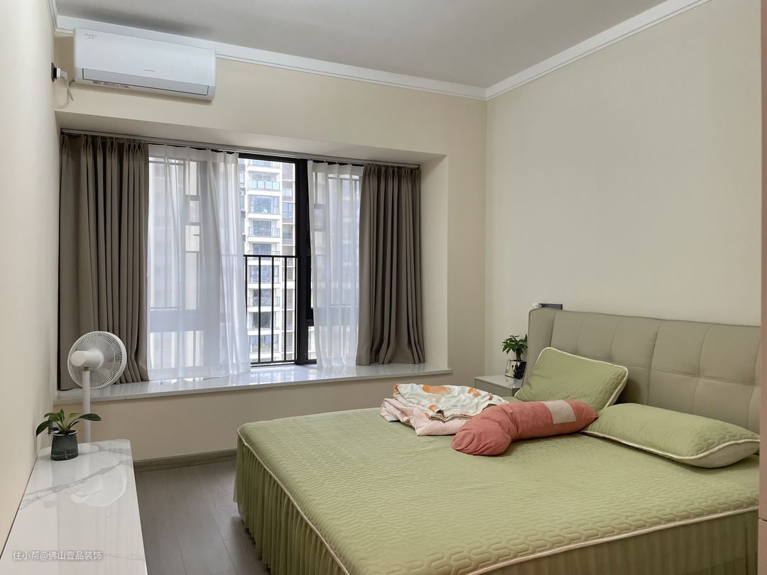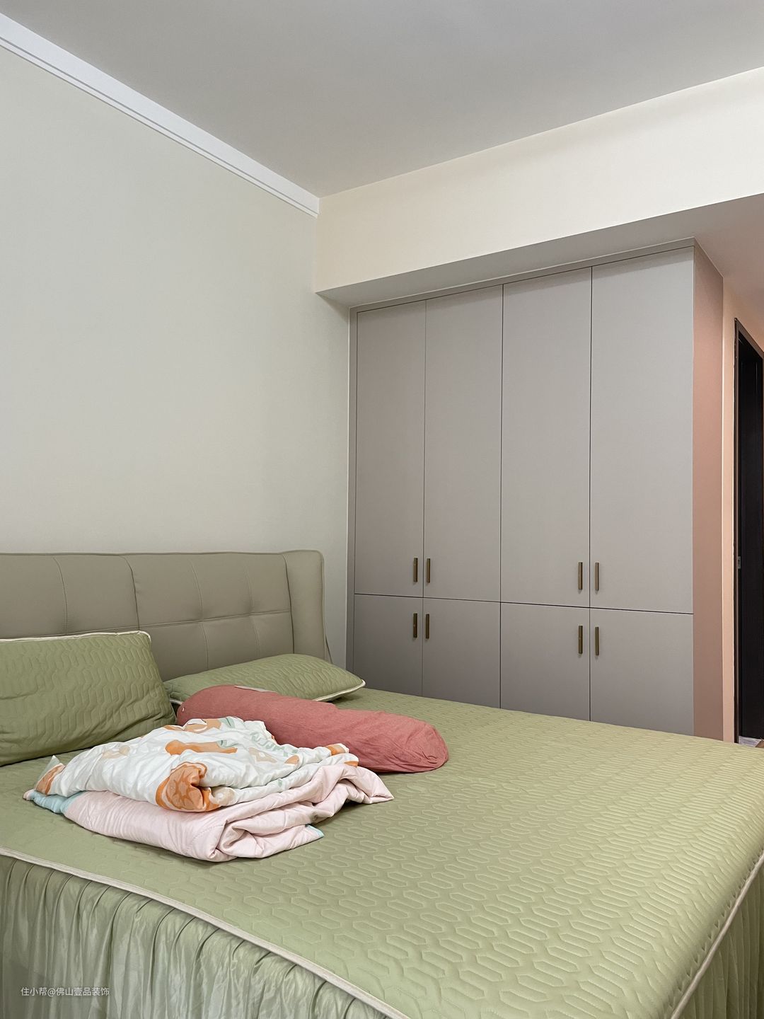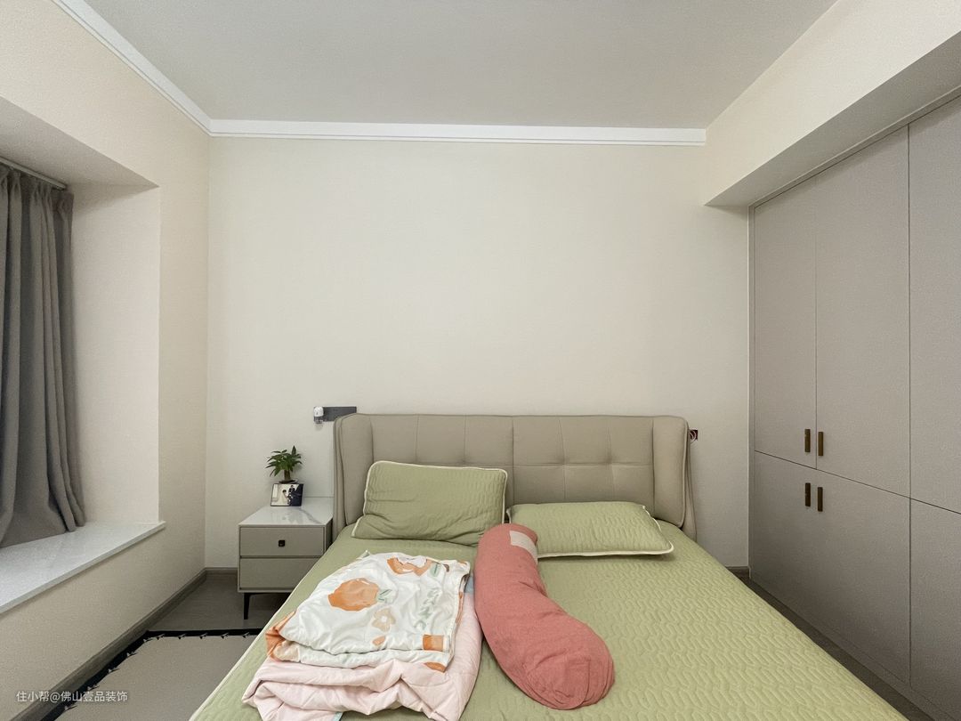主卧是粉刷了杏子灰的乳胶漆,白色的石膏线走边凸显空间的层次感,2.2米高的衣柜做了嵌入式的设计,合理的增强收纳储物的功能,同时整个卧室不会显得过于突兀,1.8米的灰调皮质床,搭配是相对协调的。
