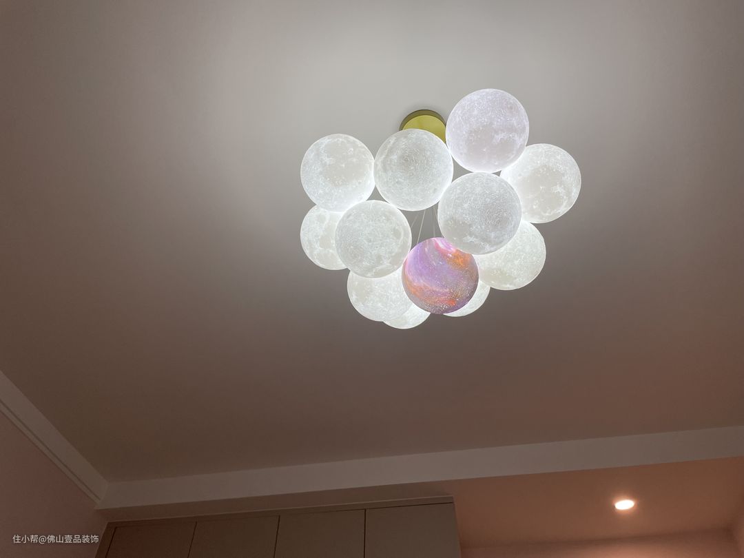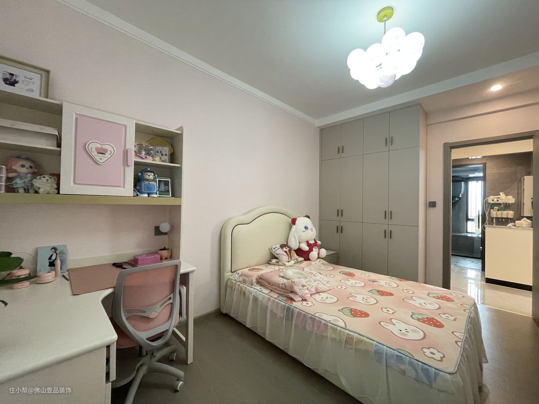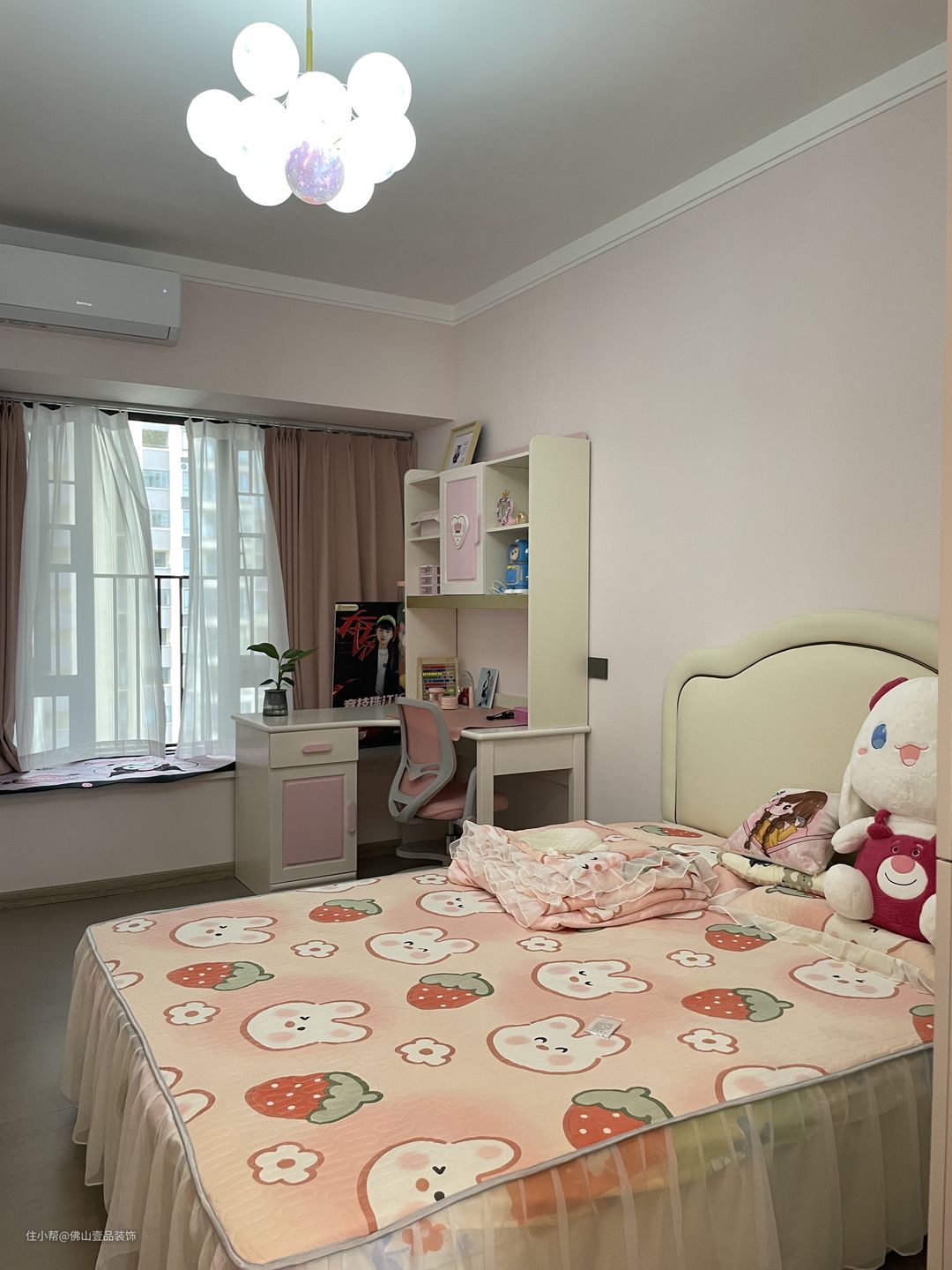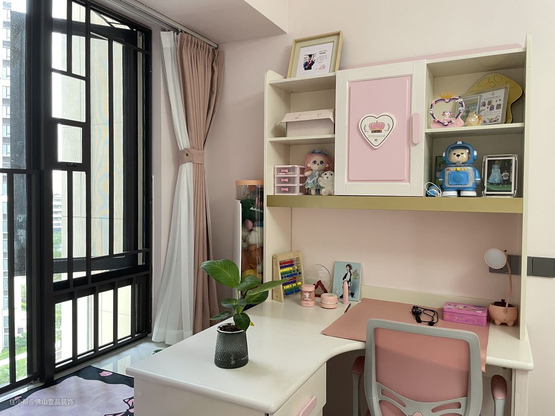 窗帘:粉色的布帘+白色的纱帘,色调不冲突。 组合灯:带有小粉色的气球灯,与学习桌是做一体的设计。
