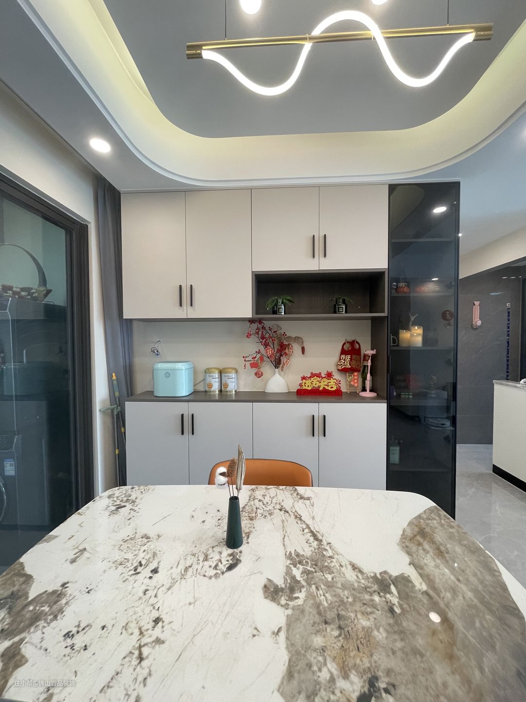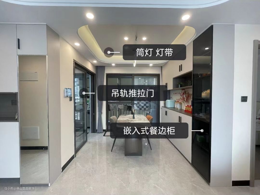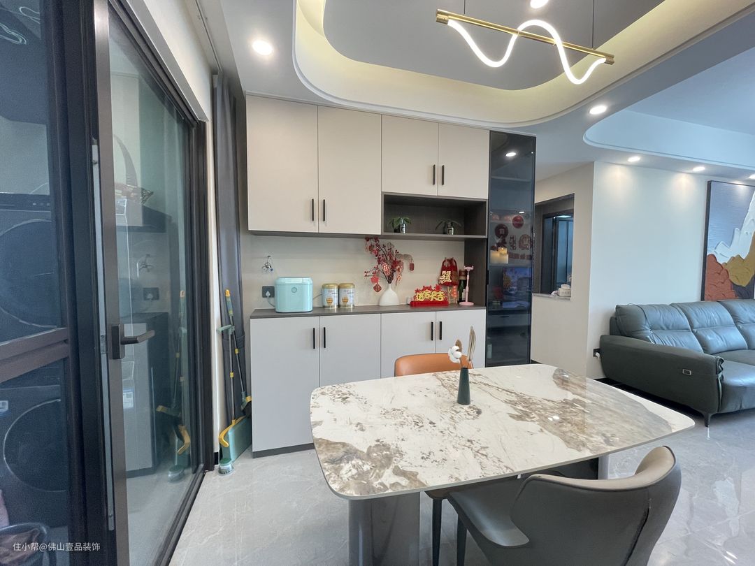 餐厅是与客厅是做一体的设计,但餐厅的吊顶是将4个筒灯直接嵌入其中,另外在整体的搭配上,利用岩板面+皮质细脚凳的,提升整个空间的品质。餐边柜是做了玻璃柜门的酒柜,内置小灯带,中间是预留了60公分的镂空,酒杯的置物架也可以搭配。