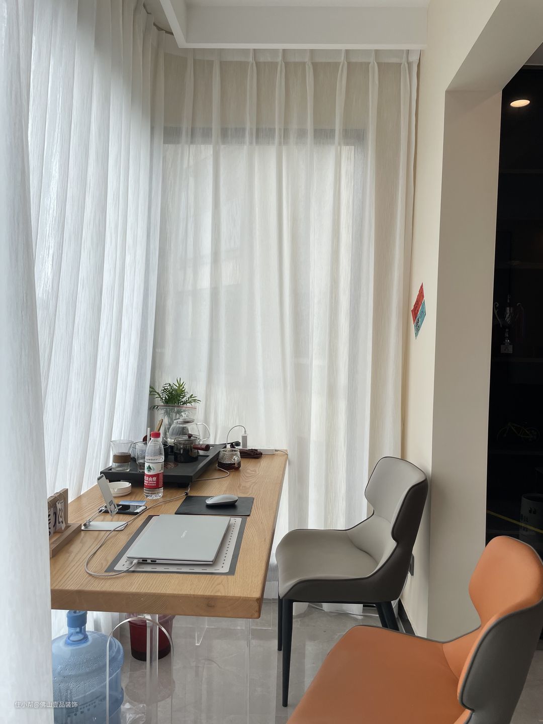 带有南北通透双阳台的设计,生活阳台没有封窗,可以感受自然风做日常的衣物晾晒,而休闲阳台封窗改造成一个学习办公区,平时办公学习都是比较方便的,而且还不影响整体的采光和通风。