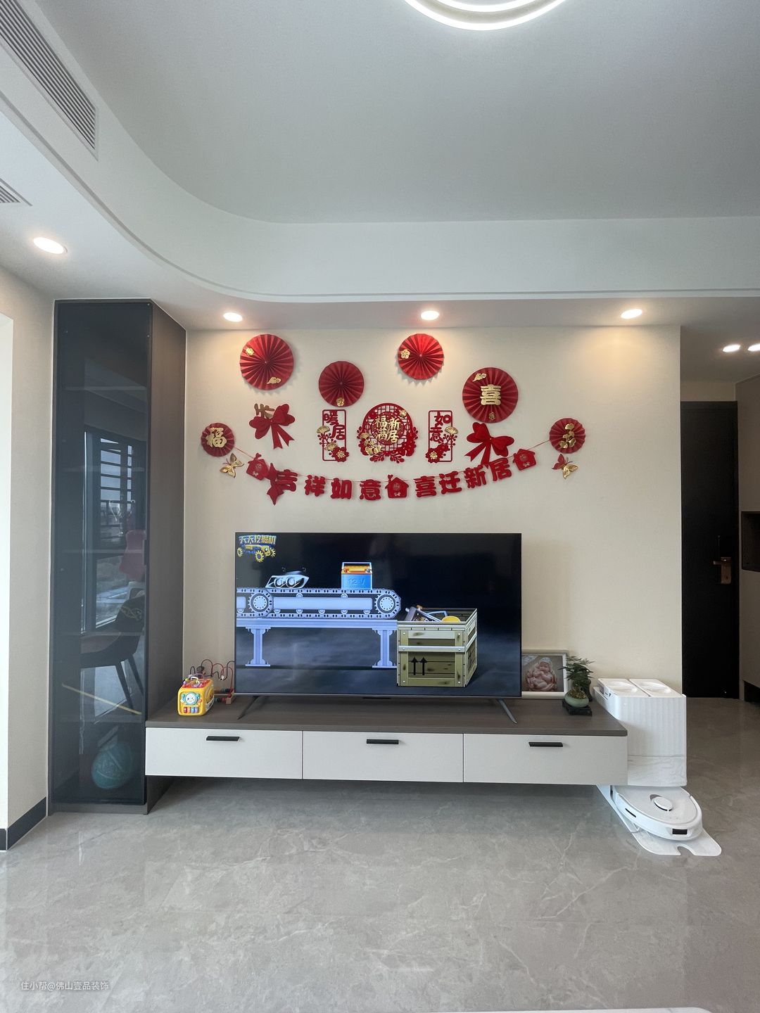 客厅没有做过多复杂造型,阳台打通了,做了封窗的设计,600*1200的灰调的瓷砖通铺,增大客厅的使用面积,整体的实用性是比较强的,L型电视柜设计,黑色的玻璃柜门防止落灰,合理的提升收纳储物的功能。墙面是粉刷奶咖色的乳胶漆,一字型布局的灰调一字型沙发,搭配很是温馨。