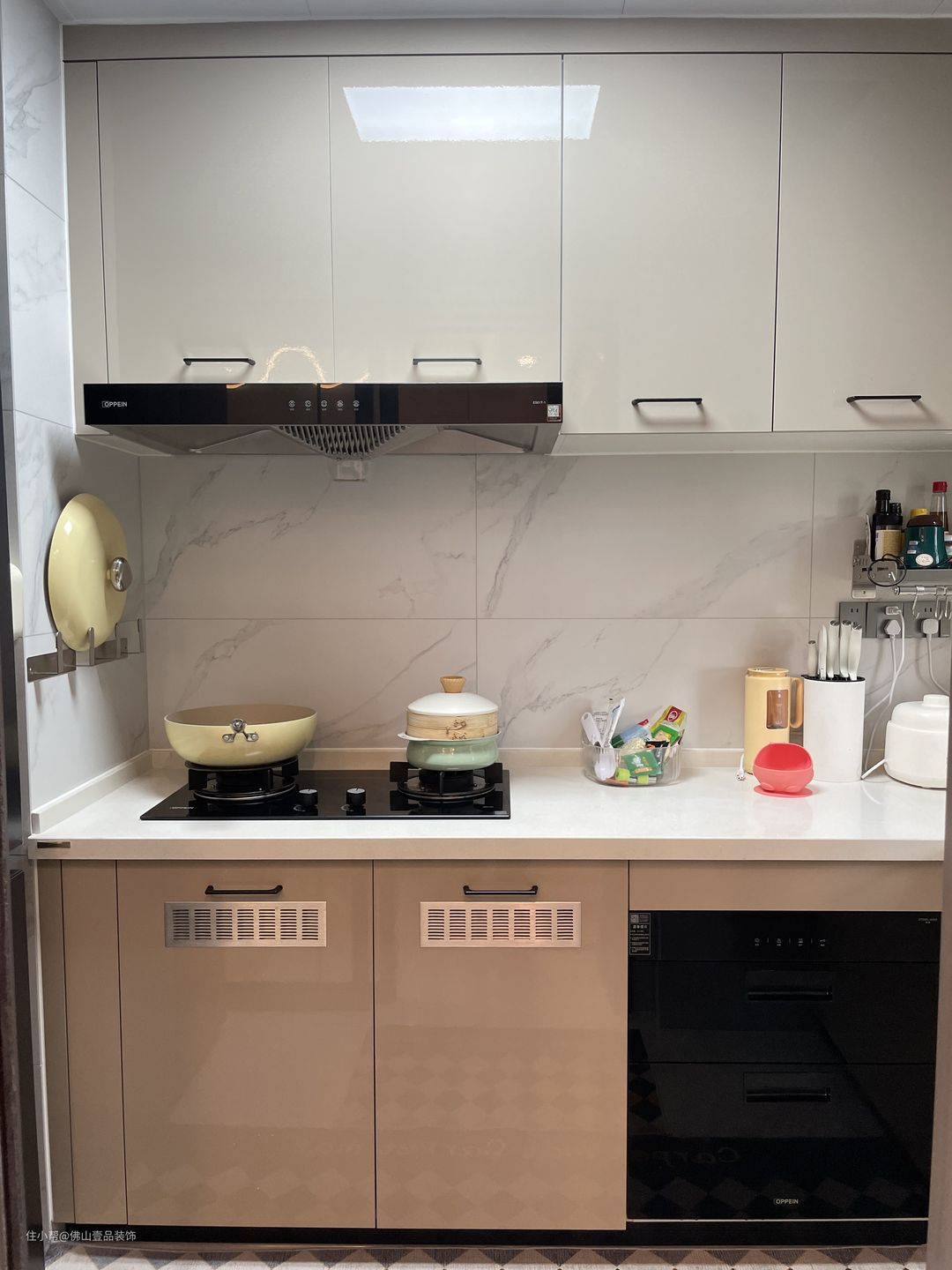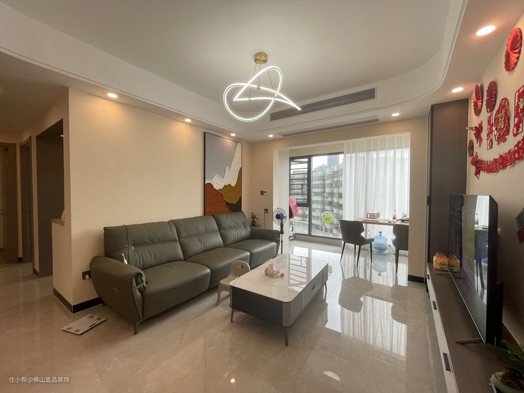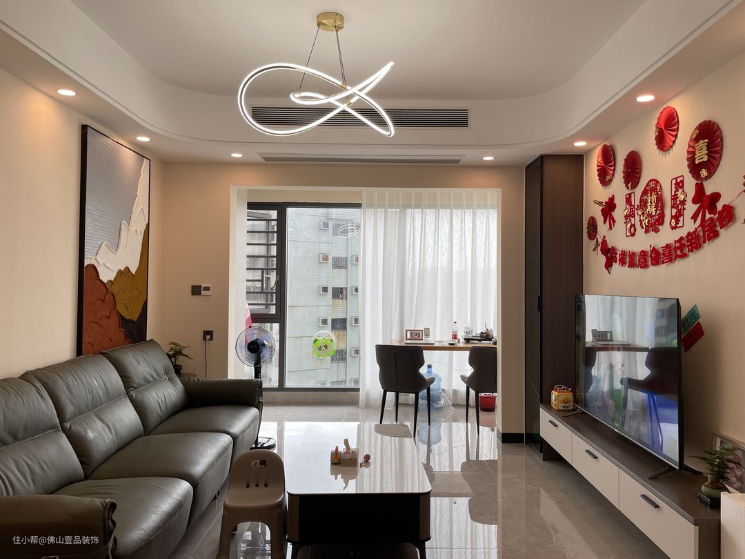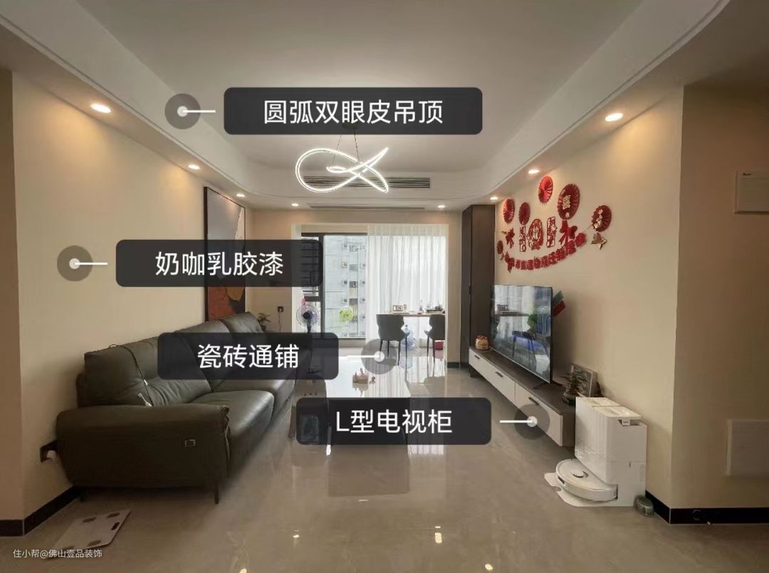 1.客餐厅是做了圆弧的的双眼皮吊顶设计,凸显了浪漫的时尚质感,同时在靠近沙发的一侧搭配大幅挂画,富有质感、 2.墙面粉刷了奶咖色的乳胶漆,营造了温馨的氛围感,搭配瓷砖通铺,整个空间也比较宽敞。 3.厨房做吊轨的推拉门设计,方便日常的卫生维护打理。 4.利用飘台增强收纳储物的功能,降低小面积空间的压抑感。