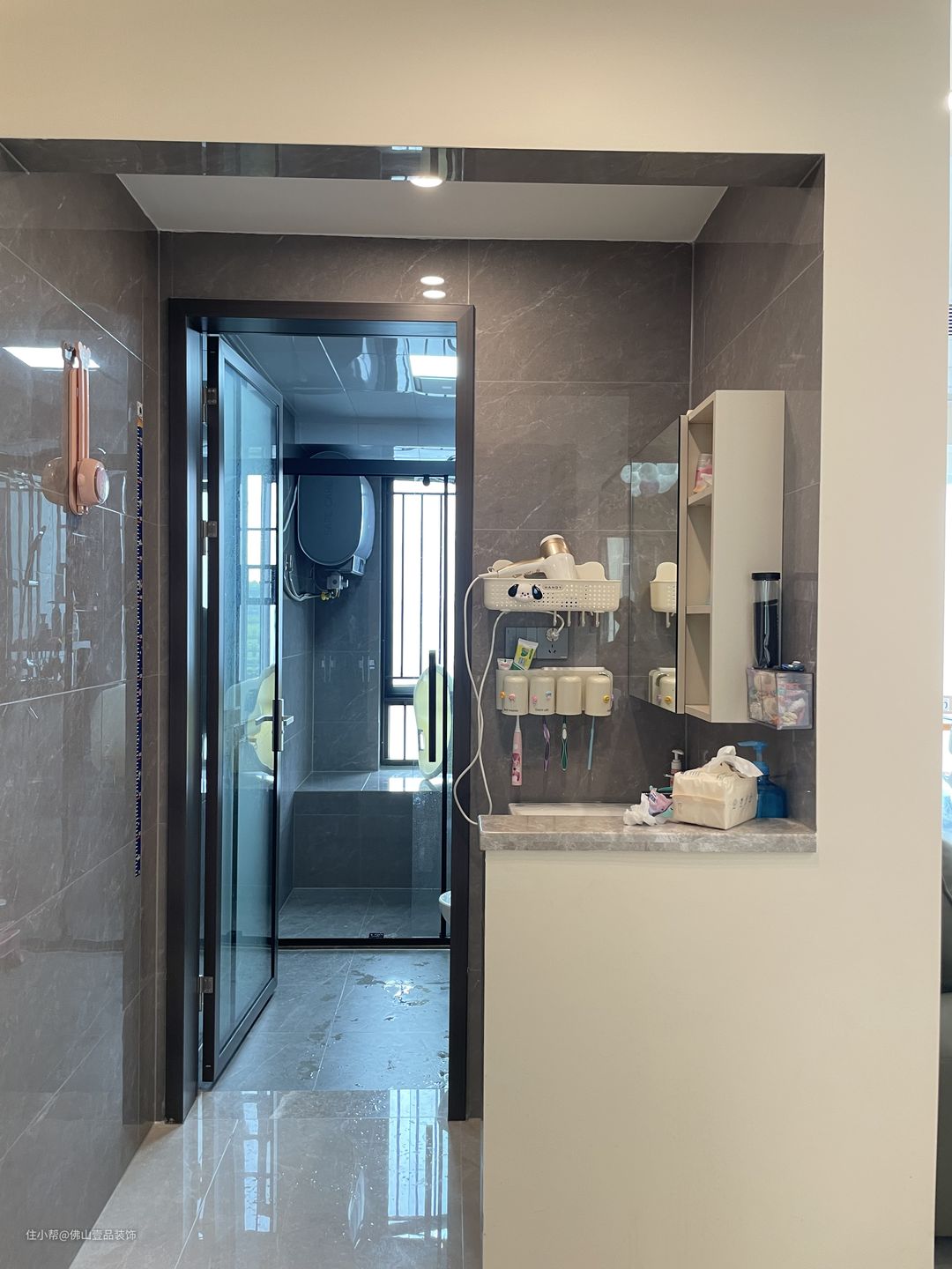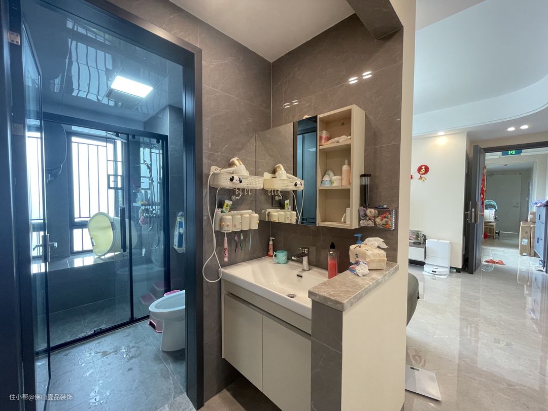 两个卫生间都做了干湿分离的设计,客卫将洗漱台移到过道做半墙的设计,带有收纳功能的化妆镜,墙排形式的陶瓷浴室柜,还有电动牙膏牙刷的置放位,淋浴区利用玻璃的推拉门做干湿分离,整体很简单实用的。