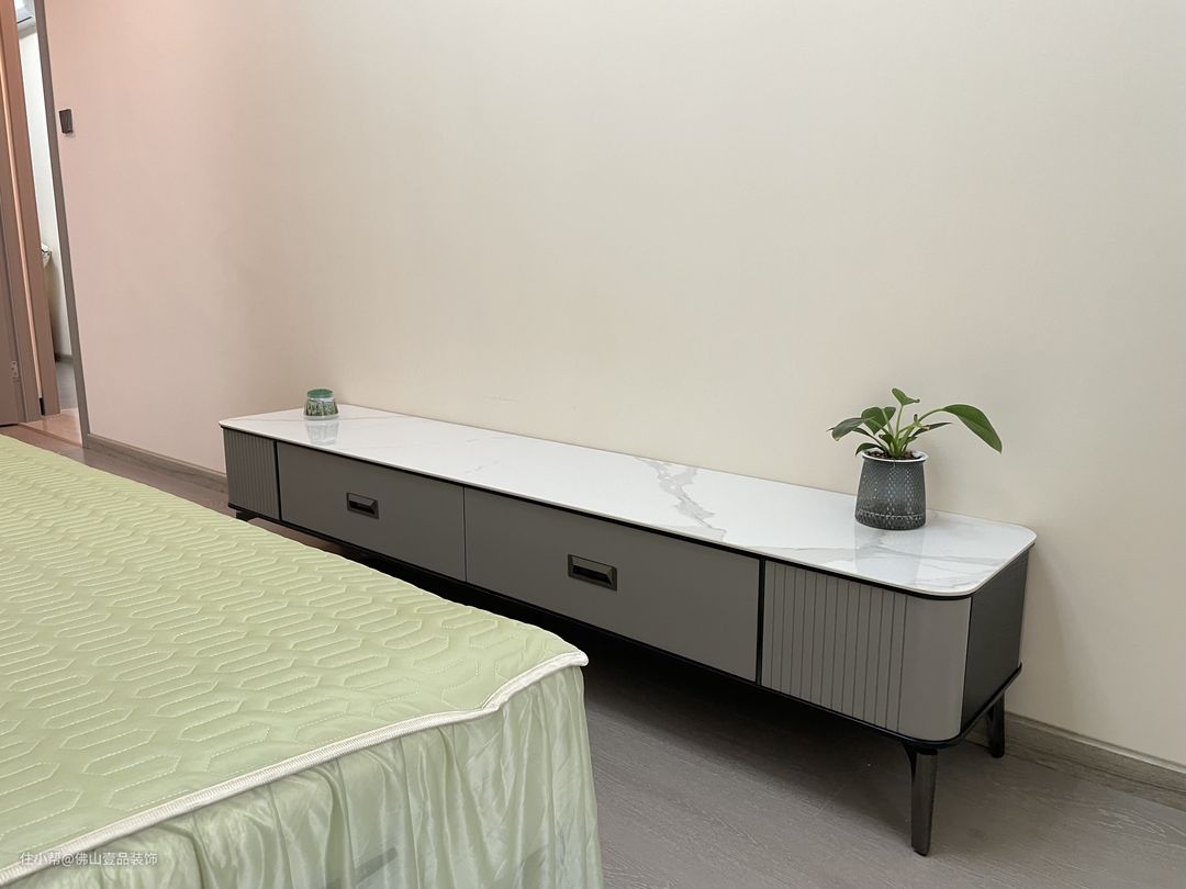 四件套:选择了翠绿色的布艺四件套,简单又实用。 电视柜:后期可能会选择放置电视机的那些。