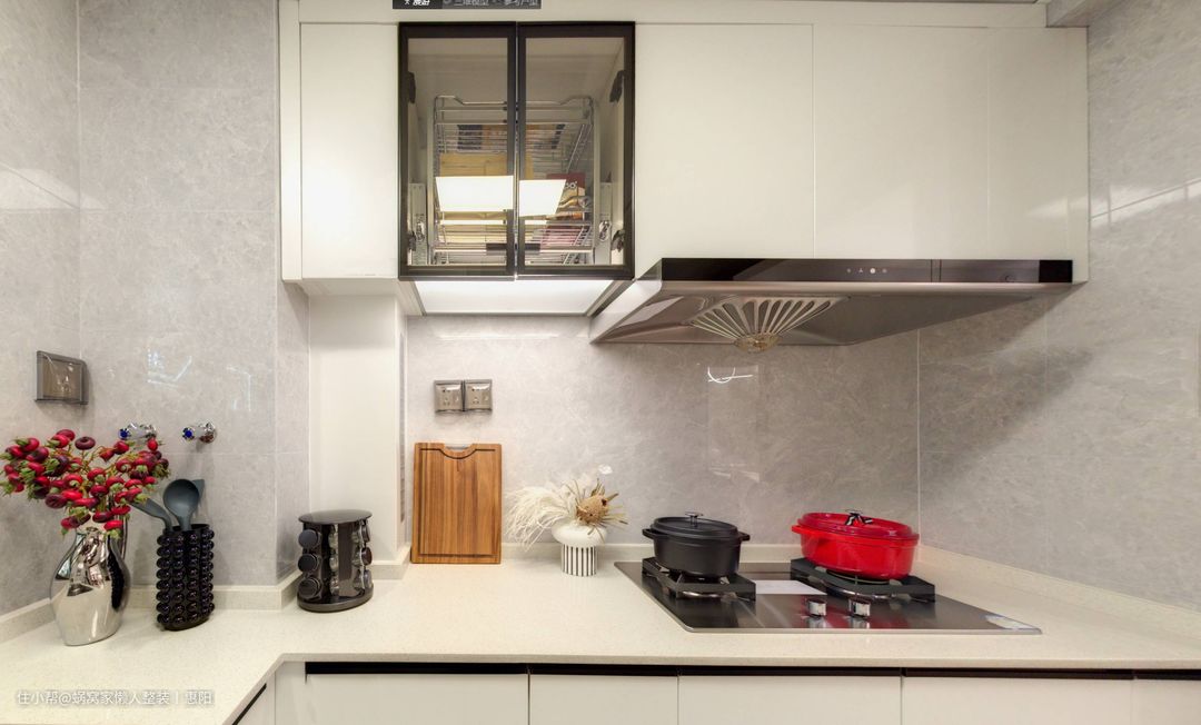 厨房是u型的布局,操作方便且动线流畅。白色台面和灰色墙面+白色的吊柜,让整个厨房看起来更加整洁和大方。厨房中加入了常用的现代化电器,集成灶、洗碗机、净水器等,解放双手提升生活品质。未来的岁月中,慢慢熬煮出幸福的味道。