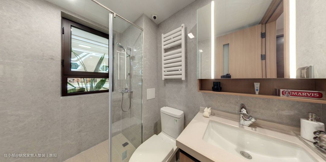 石材肌理与玻璃质地充斥在卫生间中,干湿分区,玻璃淋浴房在视觉上更显通透。以氛围灯为空间主题的屋子,即使在卫浴空间,也是必不可少的。