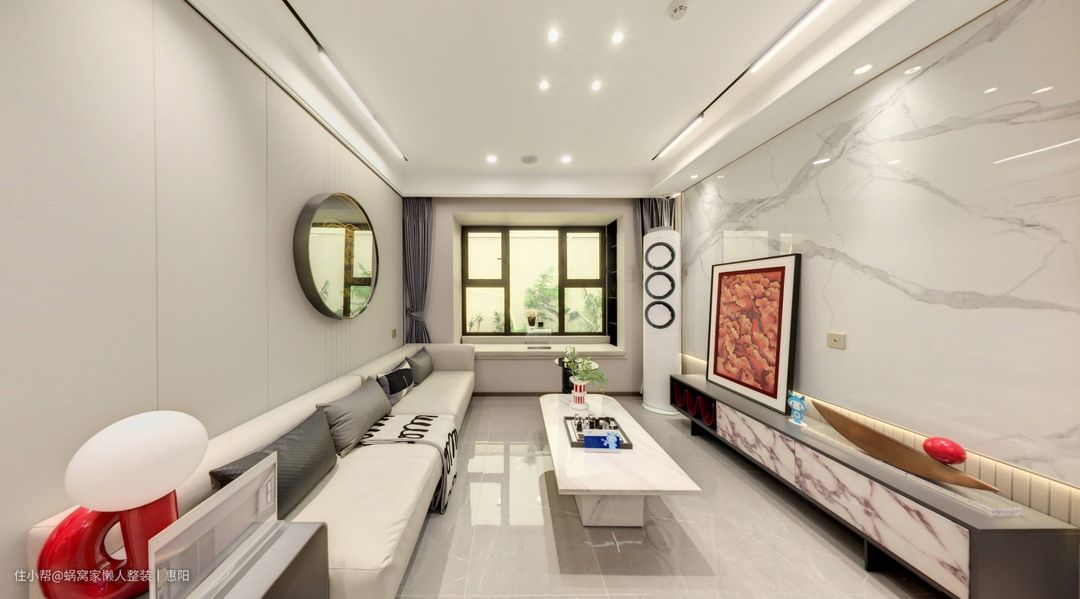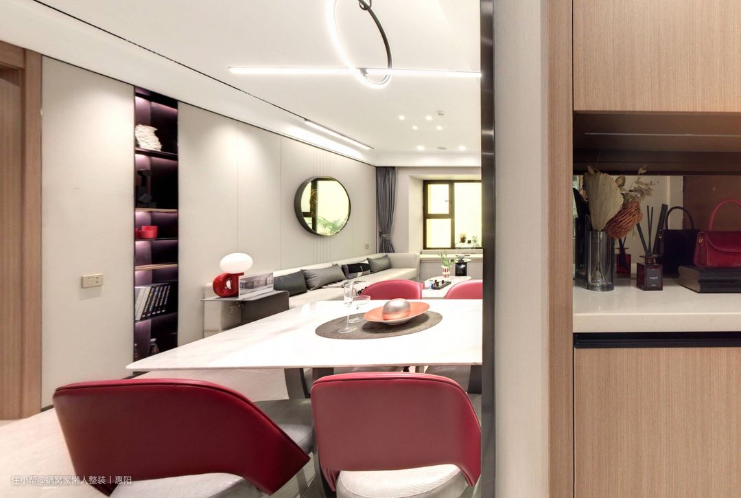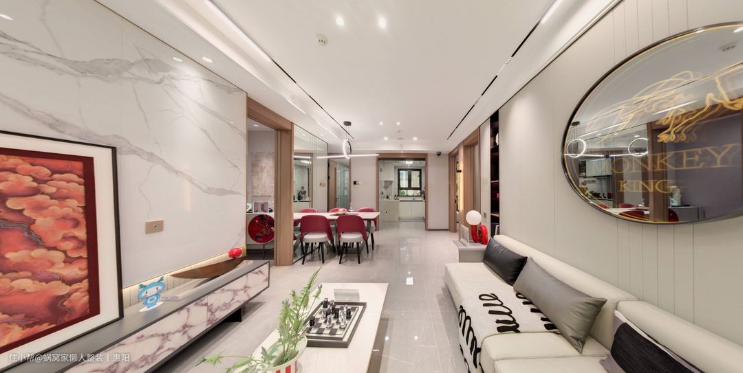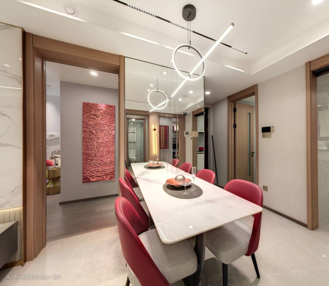 客餐厅玄关一体化设计,地面通铺亮面地砖,整体空间通透显大。客餐一体的布局十分通透,模糊空间与空间的边界感,以灯光作为功能分区依据。