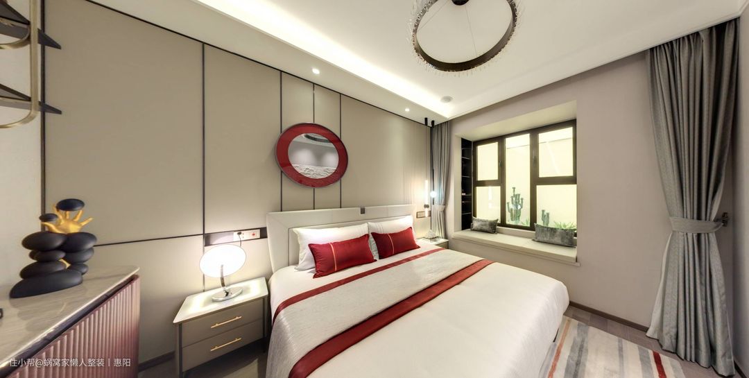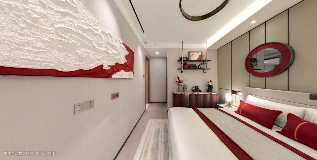 卧室,设计简约,素雅而静谧,在白色的主调下,搭配红色床品,呈现一个让人感受到精致的空间。木纹定制的柜板一体化设计效果,丰盈着精致的生活空间。