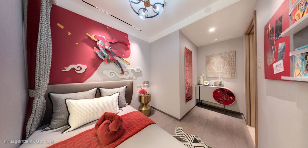 次卧以定制为主,定制款的桌柜,让整体化的空间十分有序。房间的主题是以红色为主,是屋主的特定主题。