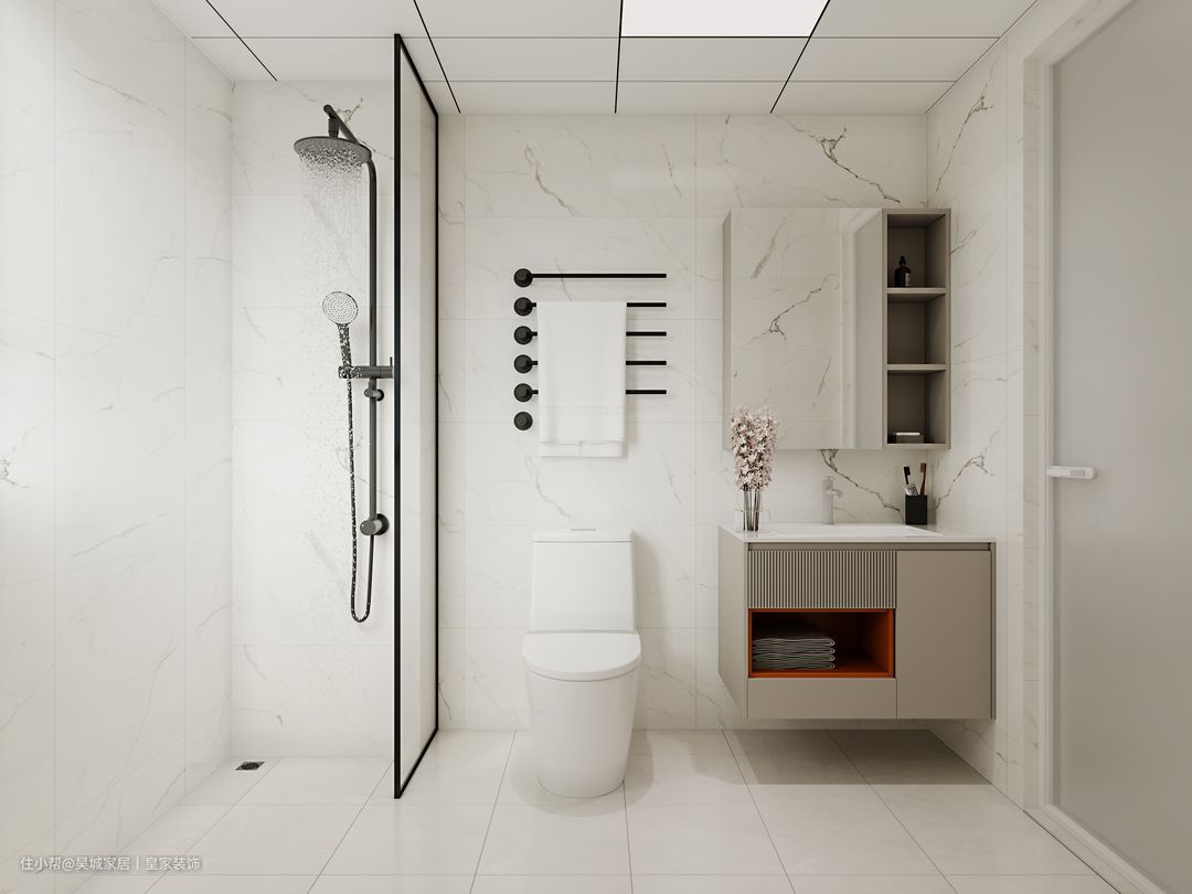 白色浴室柜、智能马桶搭配黑色隔断淋浴房,整个空间简约又清爽。