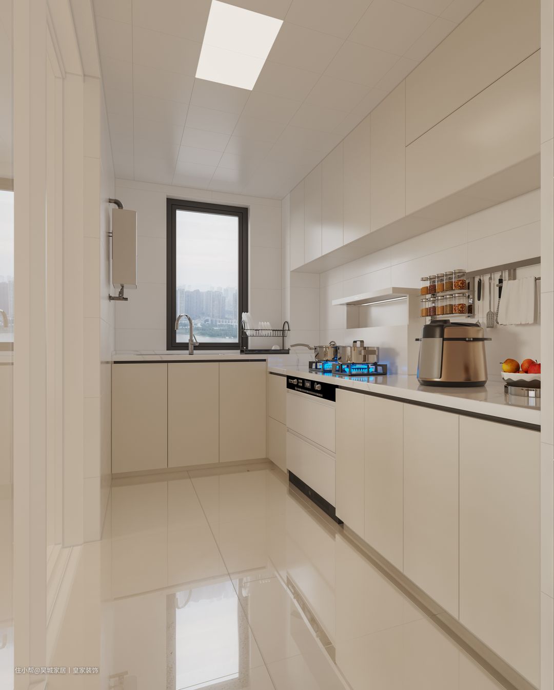 现代简约款的半开放式厨房,橱柜灶台柜一体,采用白色石英石台面,坚固耐磨,易清洁。设置L型操作台,不仅让厨房的使用者能够更加方便地进行烹饪,还能够更好地控制厨房整体的氛围。
