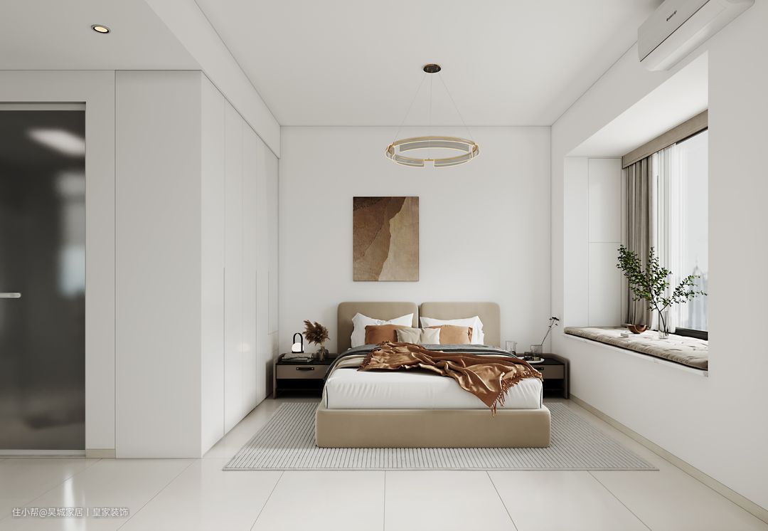 次卧一柜到顶的双开衣柜,满足房间的储物需求,方便家里人使用。房间通刷白色乳胶漆,让看起来明亮又通透。