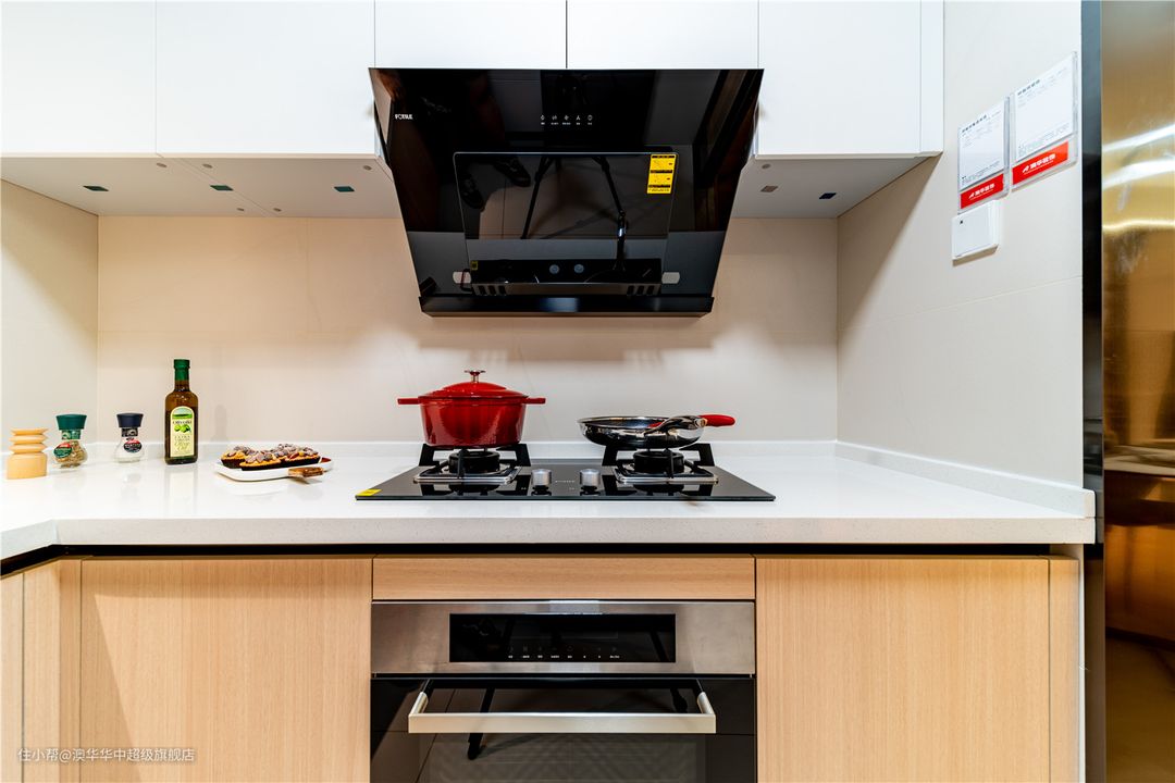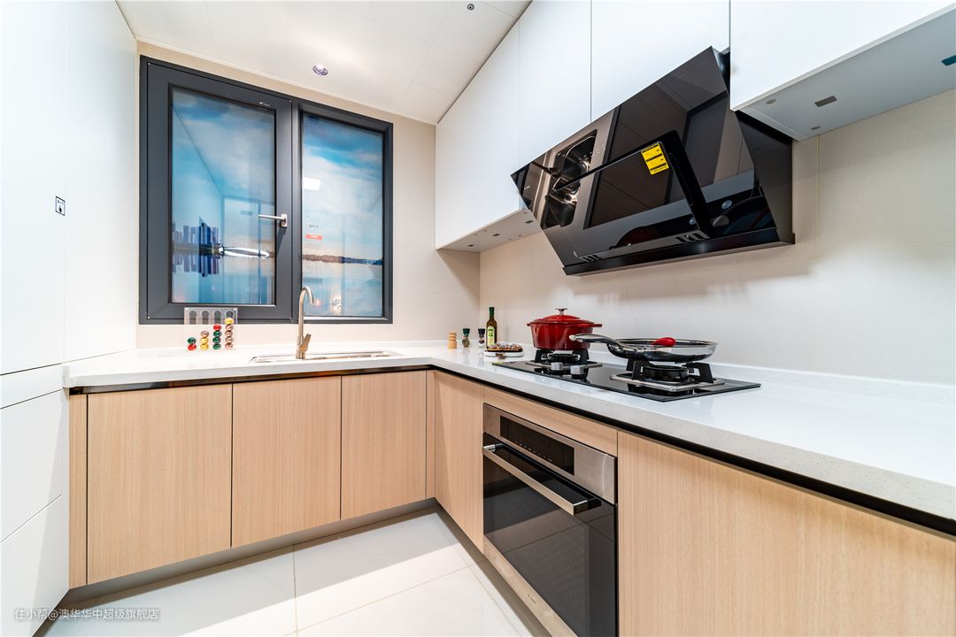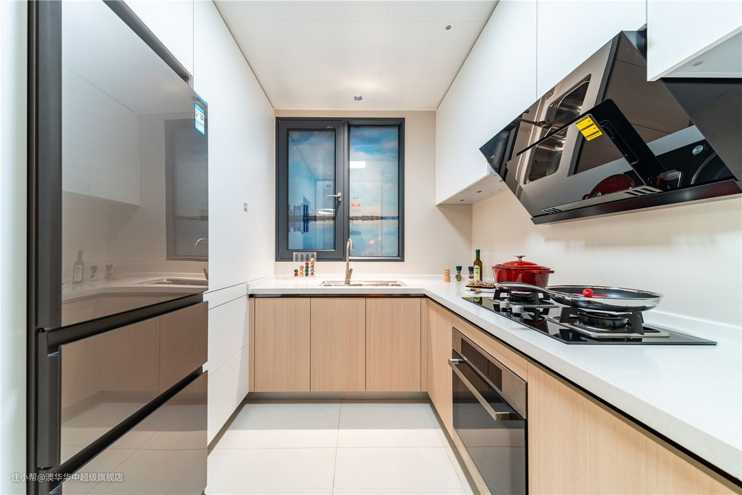 厨房紧邻餐厅,以玻璃推拉门隔断,动线简短、视野通透。大面积运用白色呈现视觉上的简洁干净,于地柜上择取一丝原木色点缀,丰富空间层次,同时带来温润的空间感受。 U型布局紧密空间结构,L型橱柜,遵循洗、切、炒的动线设计,实用又便捷。顶天立地的隐藏式收纳柜,采用按压式柜门设计,清爽又大气。提前预留冰箱位置,嵌入式设计,不浪费每一处空间。 小厨房很适合单一大水槽,所有锅碗瓢盆都能放进去,清洗更方便。同时选用台下盆设计,桌面清理更便捷。