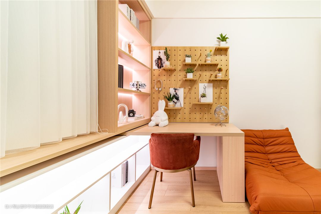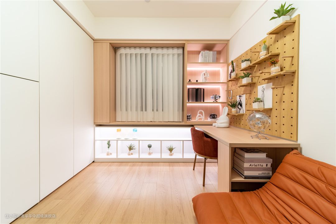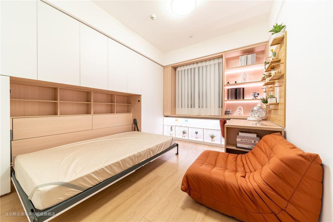 这个多功能房集学习、休闲、储物、客宿等多种功能于一体,美观又实用。白色与原木色相互融合,构成色调上的和谐平衡,细腻而又温馨。 倚墙而设的洞洞板、书桌,临窗定制的开放式展示柜,让整个空间更加有层次和个性。独立空间,不仅让阅读更深入、工作更高效。若家中有小朋友,更能增加了亲子阅读时间,为下一代培养良好的阅读习惯。 沿着墙体定制整面墙柜,柜面色彩与顶部保持一致,整体更明净简洁。同时增设翻板床,偶尔有客人过来,也有了休息的场所。