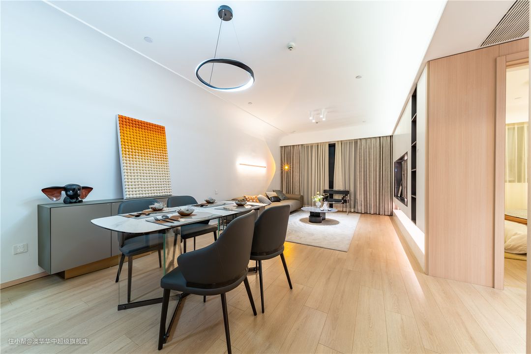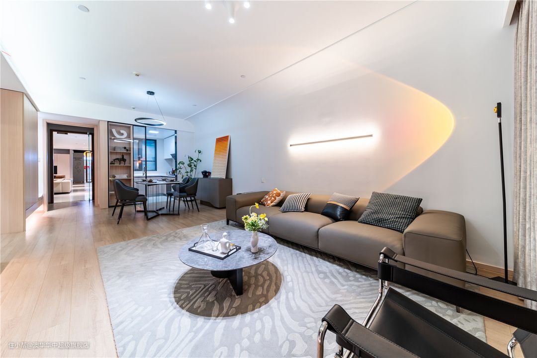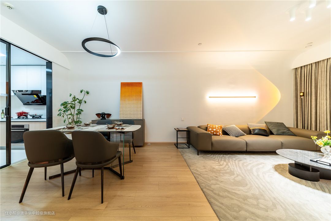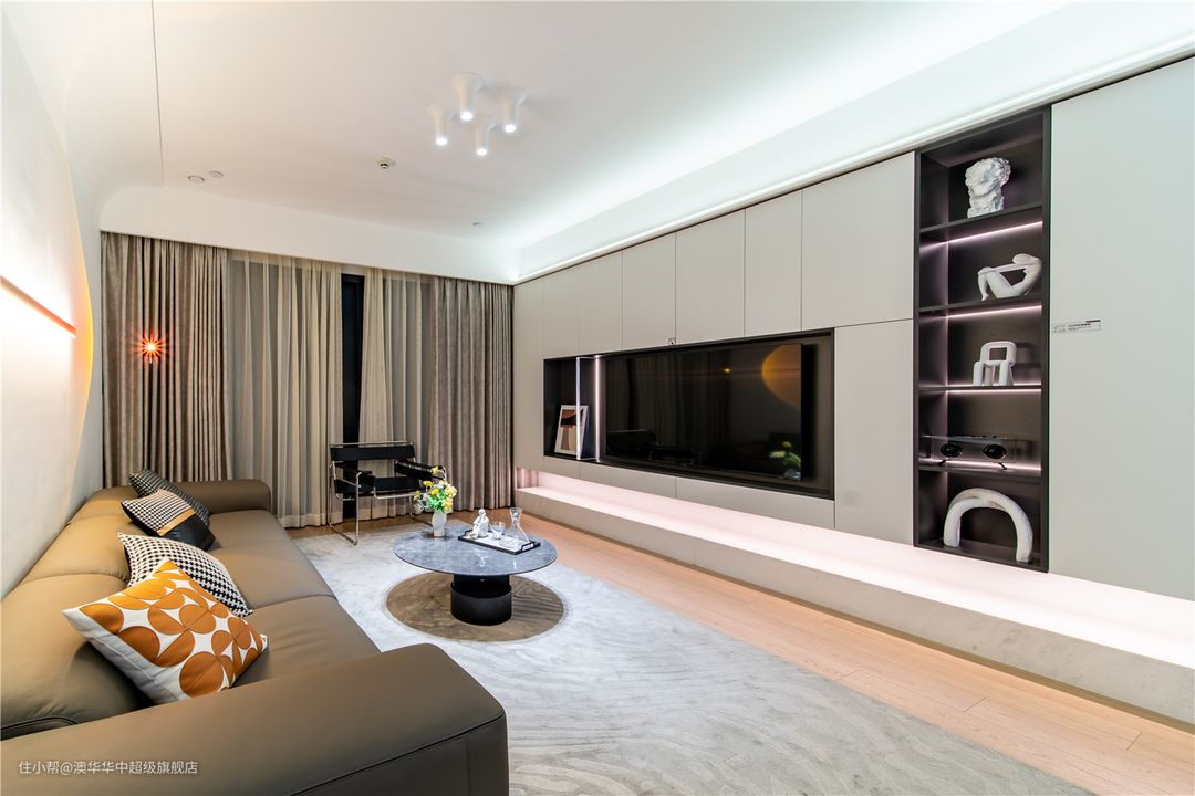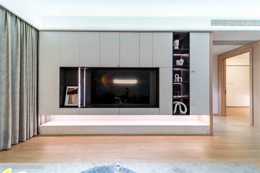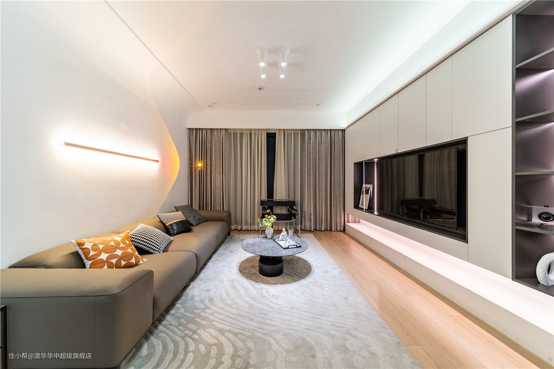 客厅用色克制而简练,以纯白+原木为主,质朴温厚的木质元素与洁净大气的纯白色系,呈现出开放、自由之姿,自然承接生活的新篇章。 无主灯与简约边吊相辅相成,呈现视觉上的简约大气,弧形转角过渡自然,柔化空间棱角,进一步加强居室松弛感。 悬浮电视背景柜,承载起客厅的收纳,有效保障了空间的整洁。无把手白色柜面,简洁又大方,搭配地台设计,层次分明。 边侧一列展示柜是点睛之笔,各种工艺展品在光影的调和下,以简洁精致的姿态不动声色地回应着居者品味与审美追求。 沙发墙面简约不失精致,一字洗墙灯填补大面积的留白,角落增设落日灯点缀,两者巧妙融合,制造了一场落日余晖的浪漫。 夜幕降临时分,与家人一起坐落于此,或看上一场电影,或开怀畅谈,美好又幸福。