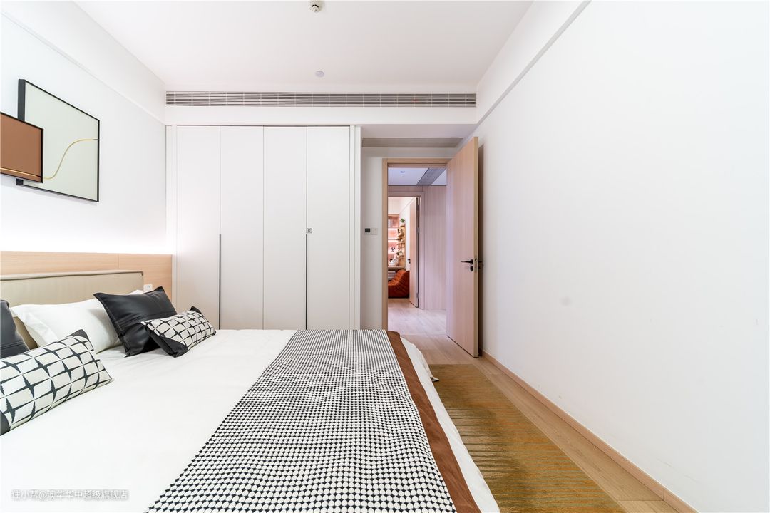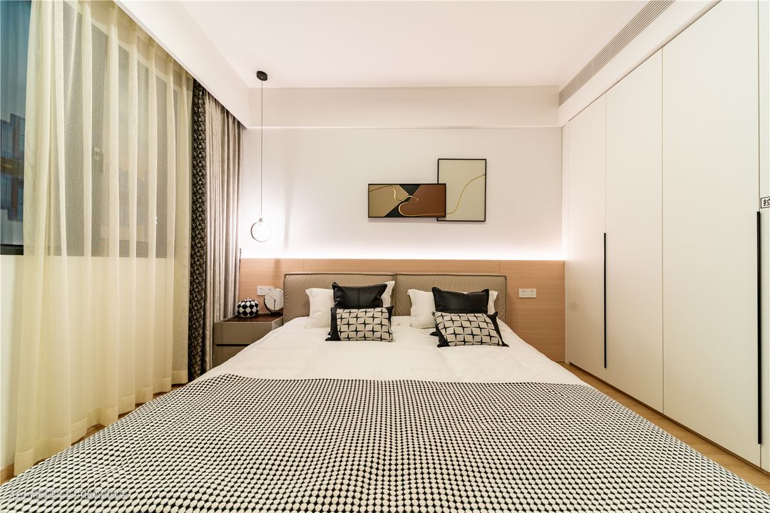 将设计立于栖居本质,卧室空间延续着客餐厅相同的色系,素雅、舒适、宜于睡眠。床头选用半墙护墙板划分层次,搭配艺术挂画,临摹出艺术美学的空间张力,再加上微妙灯带的氛围感,进一步传达出完整而丰富的情景意象。 用细节设计蕴含生活的情调,松软皮床给予居者饱满的安全感,木质地板和亚麻地毯的强强结合,加强睡眠空间的舒适度,角落一盏吊灯点亮床头,充分体现空间的秩序感及艺术气息。 将功能与美学与整合,定制隐藏式收纳柜,将精致外化,从细枝末节处诠释“品质哲学”。