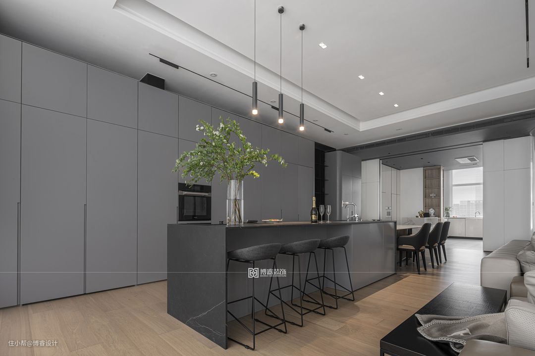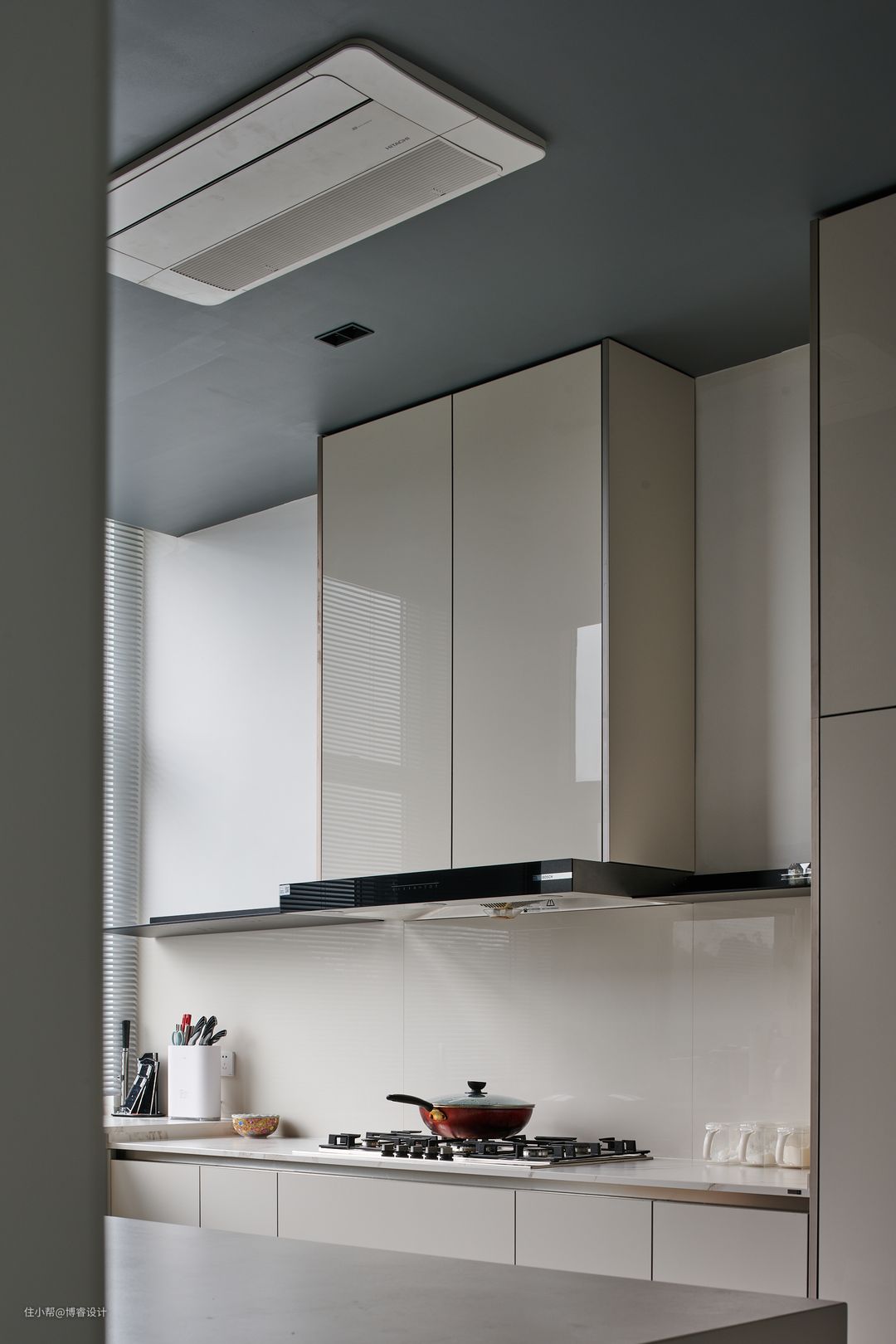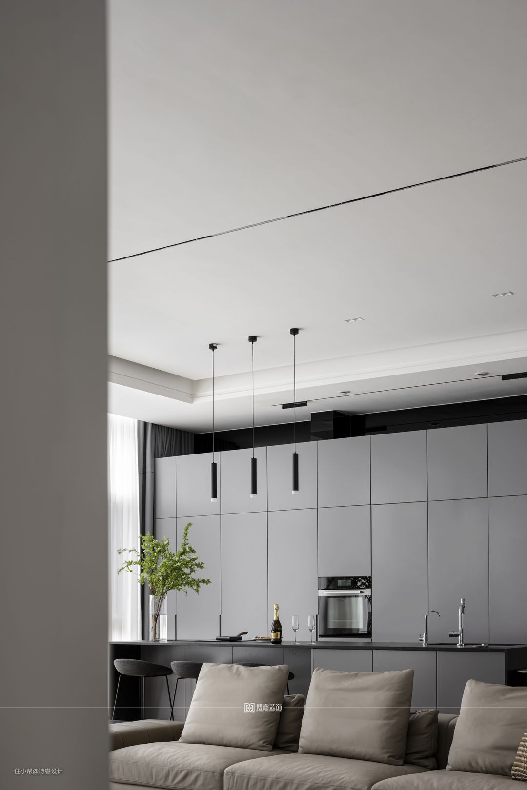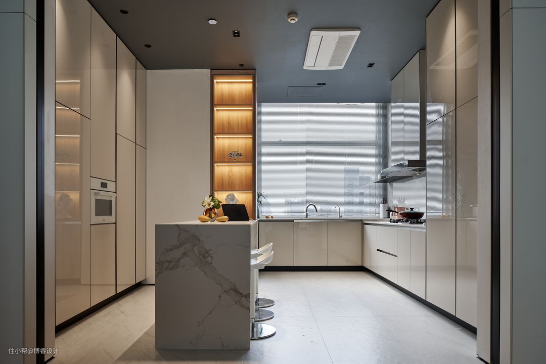 业主喜爱烹饪,常年在国外居住,空闲时间也会亲自下厨,而西厨主要承担一个餐边柜和烘焙区的功能,同时也承担着社交的功能,柜子设计成隐藏的蝴蝶门,打开后是一个操作台,最大程度提高空间利用率。 中厨结合岛台,满足业主不同的饮食需求。这个区域最大化的将景观和采光合二为一,一边做菜一边欣赏窗外的美景也是十分享受。中厨采用L型洗切炒动线,操作流畅。一组高柜收纳了一台嵌入式蒸箱,另一侧的岛台既是料理台也是吧台,使用需求可以随意切换。