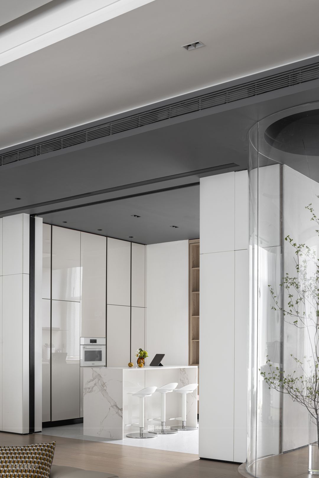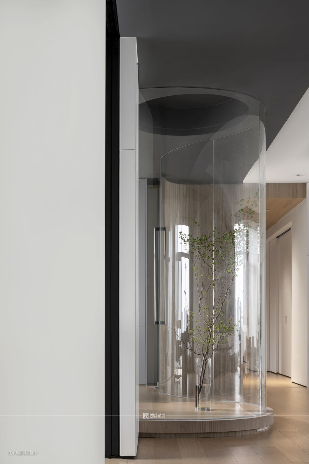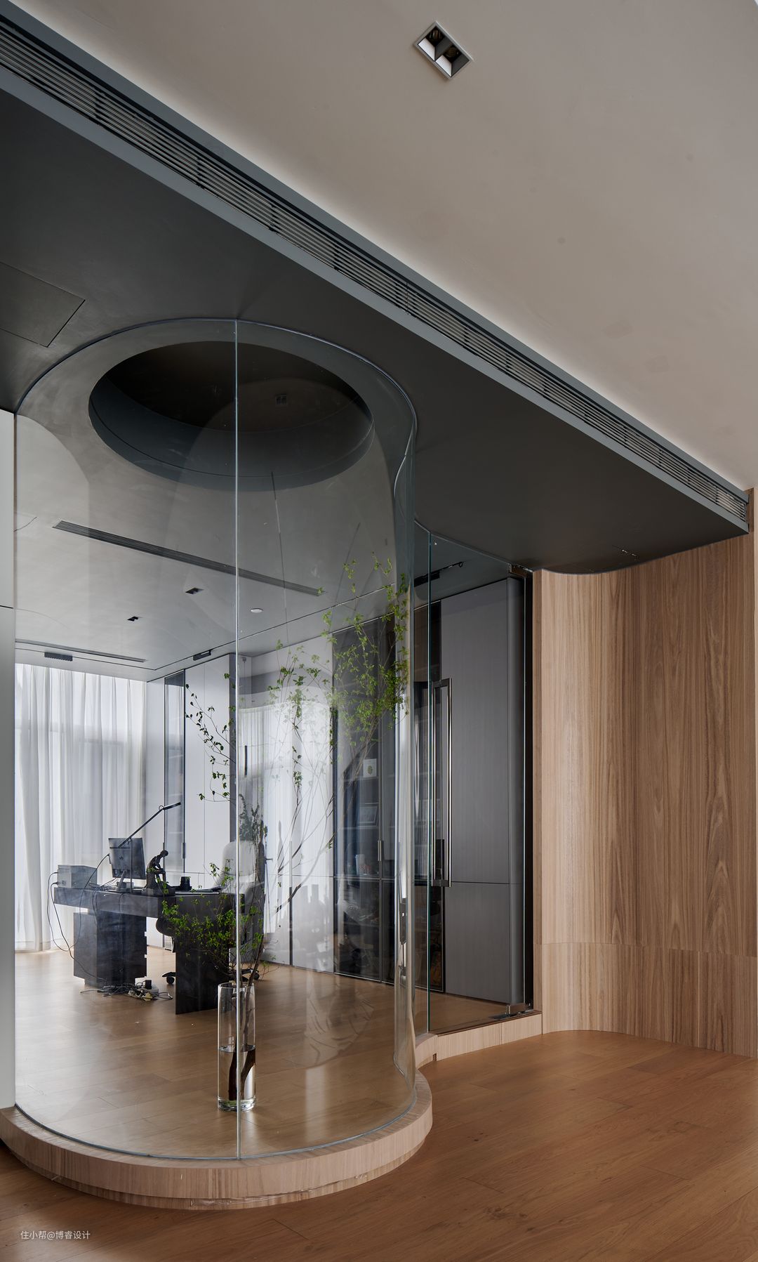 进门玄关映入眼帘的是那颗吊钟树,透过玻璃,像一幅画,像一个景,就那望着它,一天都市生活的疲惫瞬间就消失了。在树的上方利用层高优势模拟天花效果,所有的设计围绕着玄关开始了。 公共区域以吊钟树为中心,围绕弧型的玻璃,所有设计元素由此迸发,将玻璃,天花,墙面,以至于地面融为一体。原建筑近百平方的大厅功能区分,被设计师分成了中厨、书房、西厨、餐厅、客厅五个区域,设计师考虑到空间功能间的互动,隔而不断的设计方式,既能互动,又相对独立。