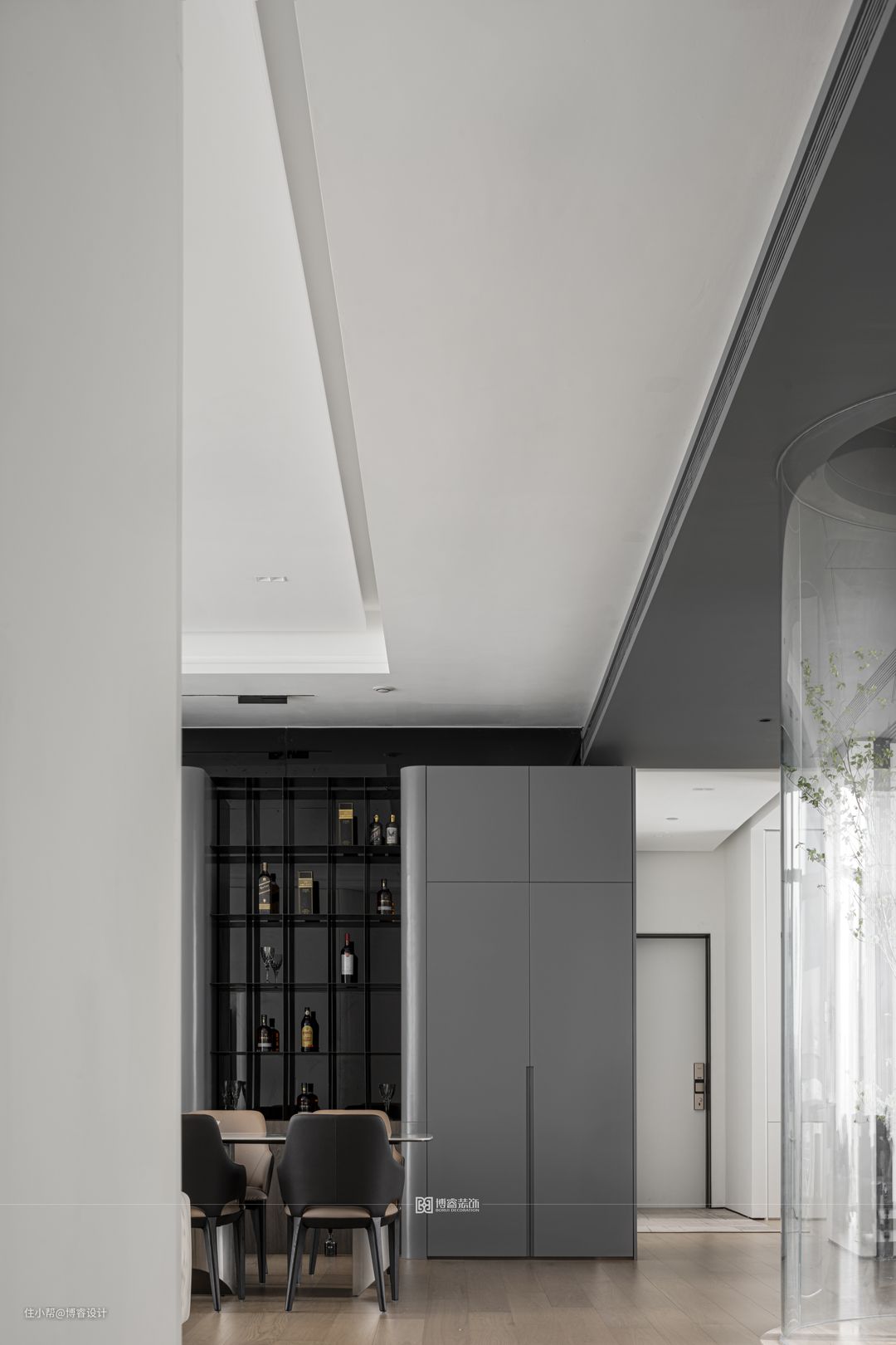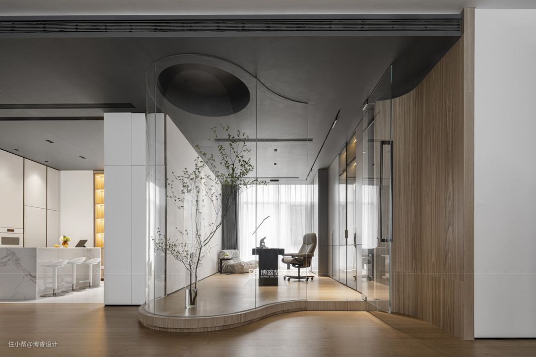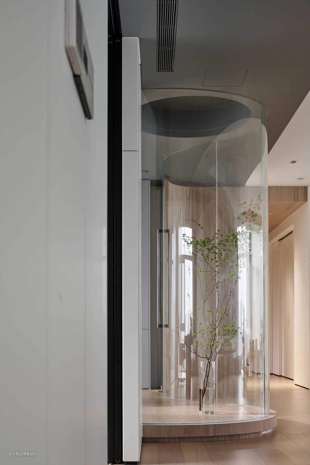 进门玄关映入眼帘的是那颗吊钟树,透过玻璃,像一幅画,像一个景,就那望着它,一天都市生活的疲惫瞬间就消失了。在树的上方利用层高优势模拟天花效果,所有的设计围绕着玄关开始了。 公共区域以吊钟树为中心,围绕弧型的玻璃,所有设计元素由此迸发,将玻璃,天花,墙面,以至于地面融为一体。原建筑近百平方的大厅功能区分,被设计师分成了中厨、书房、西厨、餐厅、客厅五个区域,设计师考虑到空间功能间的互动,隔而不断的设计方式,既能互动,又相对独立。