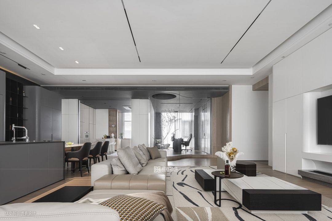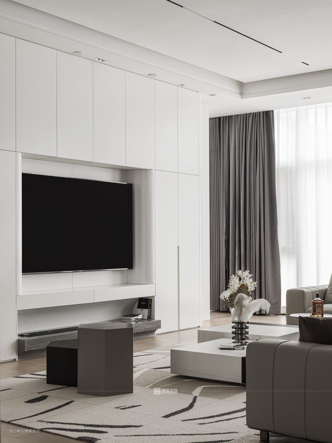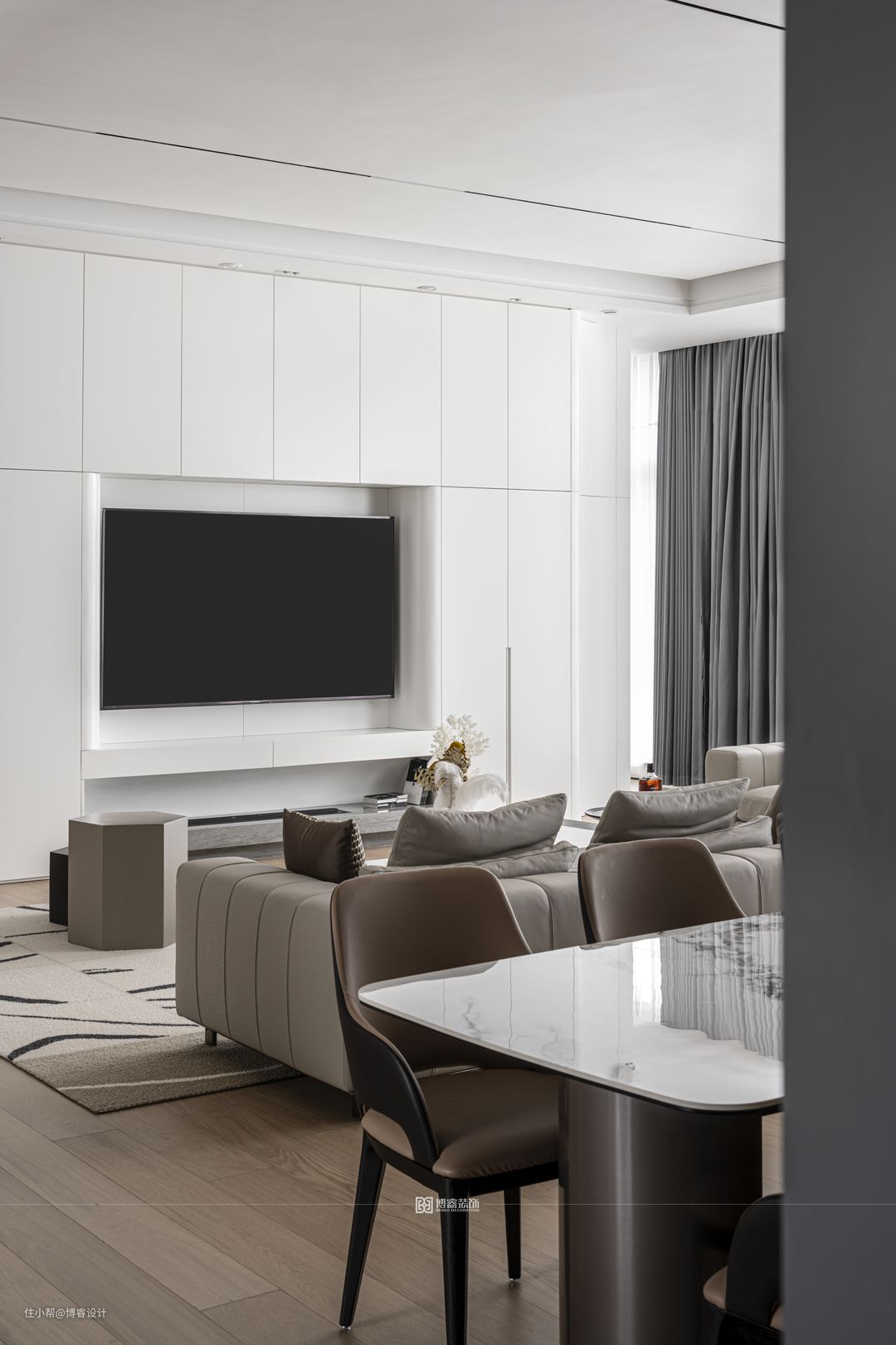 客厅是以暖色调为主,橡木色木地板与白色天花的简约设计,正好搭配出温馨的感觉。采用无主灯的设计,选用的是4000K色温,明亮防眩不晃眼,同时氛围感十足。 采用隐藏式烤漆柜形式的电视背景墙,满足业主极大的收纳需求。同时设计中考虑电视机的走线,将线隐藏于柜体内,使之更加干净整洁。 选用现代模块组合沙发,不仅容易打理,还能自由组合满足不同的户型需求,提升客厅的灵活性。