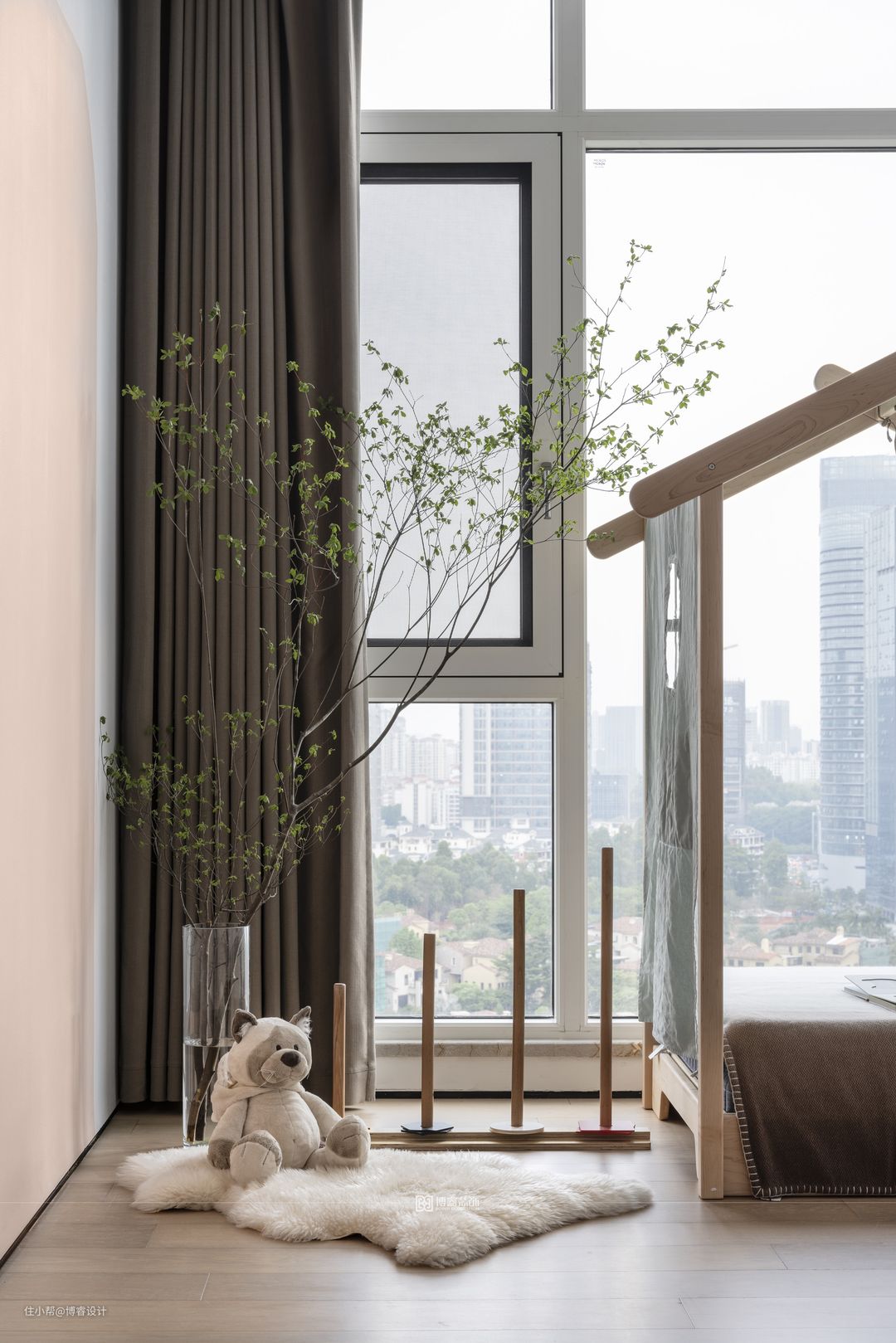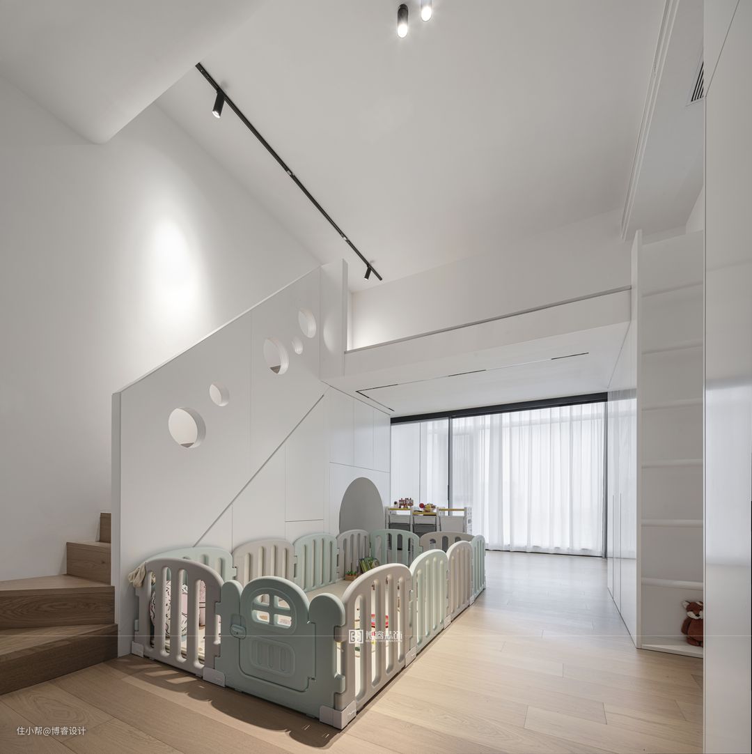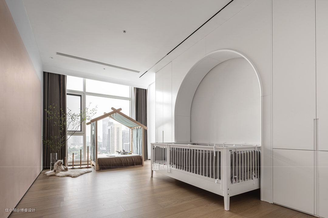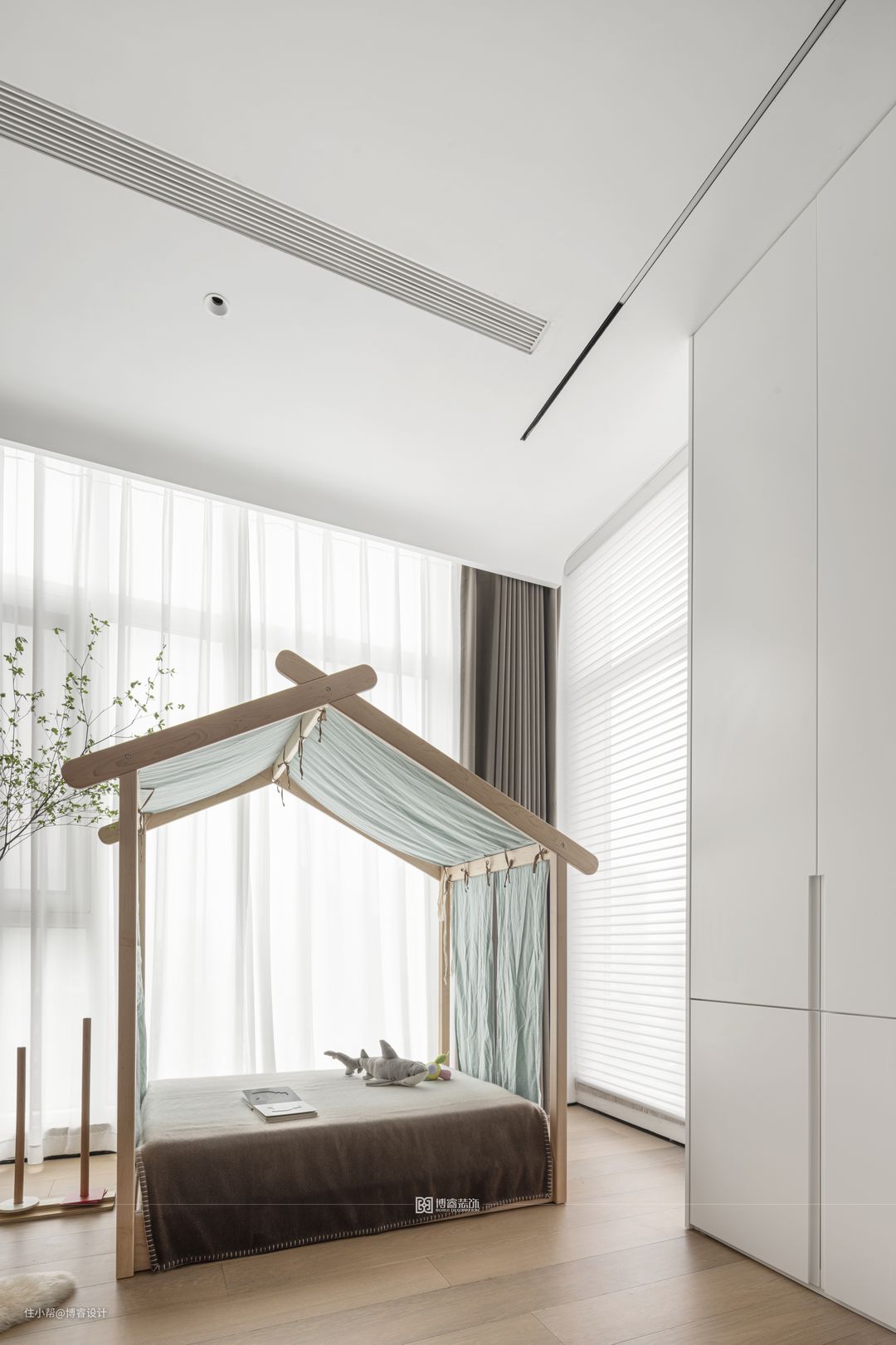 在儿童房的陈设设计中,设计师营造了一个富有童趣、能带给人们更多来自艺术设计灵感的空间氛围。 拱形置物架的设计,引发了孩子的好奇心。当孩子走进该空间,能够随意坐在地毯上,嬉戏玩耍,让孩子在其中感受美妙的游戏时光。 小孩活动区的设计中,游戏功能与动线串联起来,形成小孩子玩乐的特殊动线。将小孩与客厅相结合,形成回形动线方便小朋友活动,同时将小孩活动区作为多变空间,现阶段还可以作为客房,后期增添新成员时也可以作为小孩房使用。