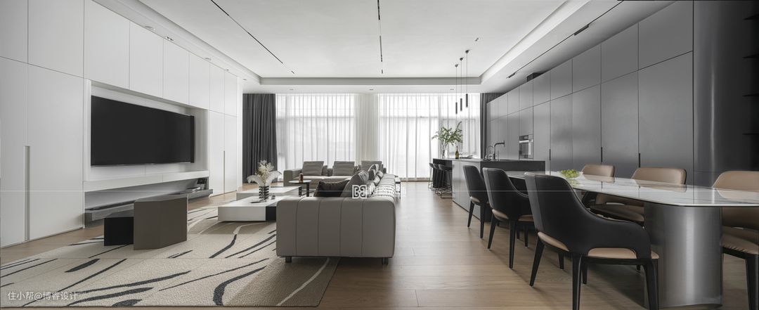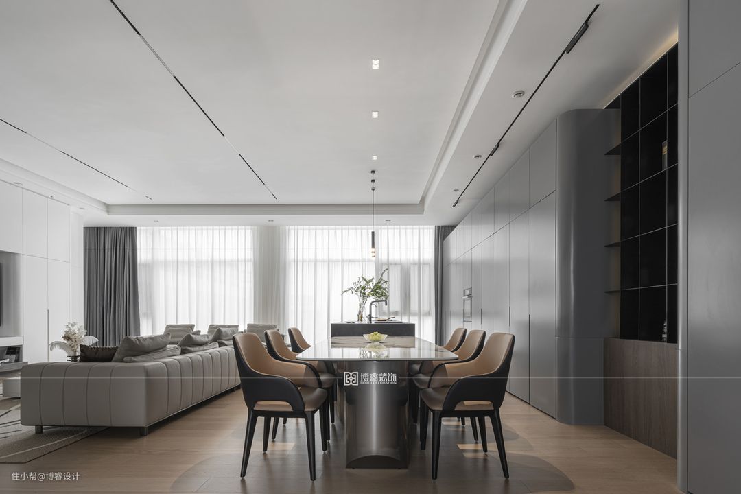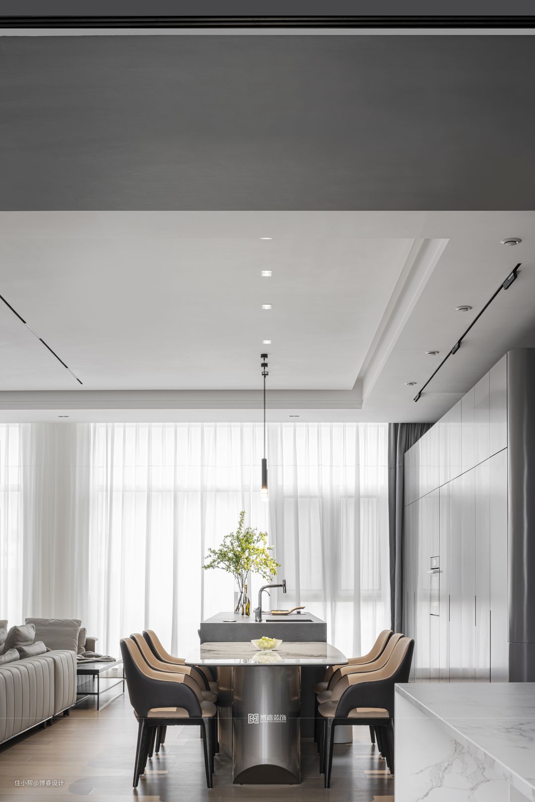 客餐厅一体式布局,两扇大落地窗,为空间带来明亮的阳光以及充足的照明。考虑到聚餐,餐厅选用岩板台面的6-8人餐桌,满足多人的用餐需求。