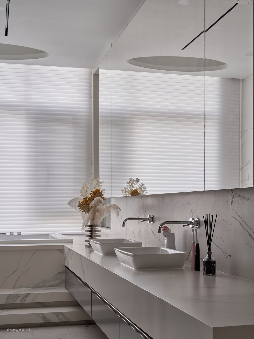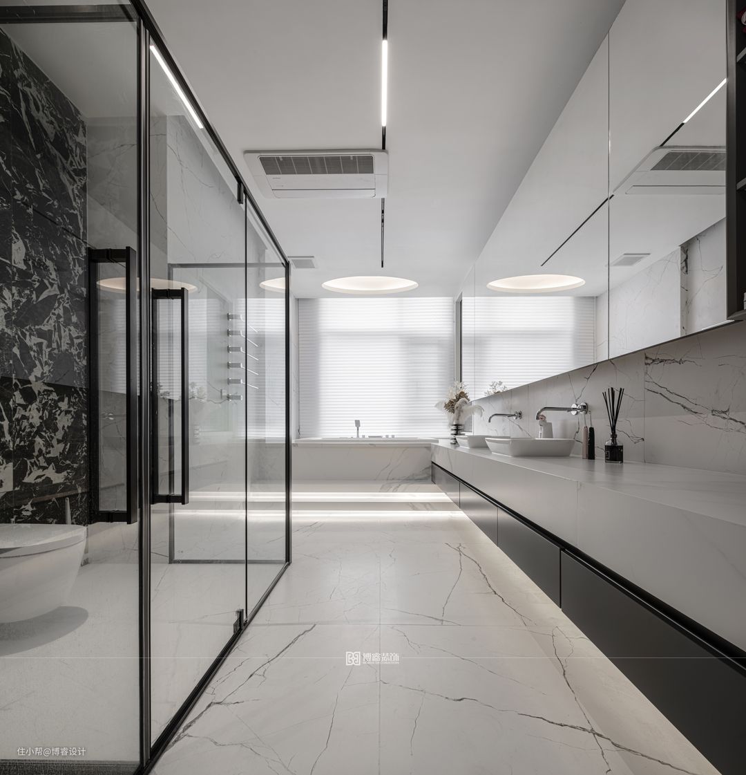 卫生间采用干湿分区,拥有独立淋浴间与独立马桶间。洗手台与浴结合形成L型体块,更具流线感,在空间中,黑色属于后退色,黑色的瓷砖与白色瓷砖产生对比,显得空间更加宽敞,节奏更清晰。隐藏式电热毛巾架与墙面融为一体。