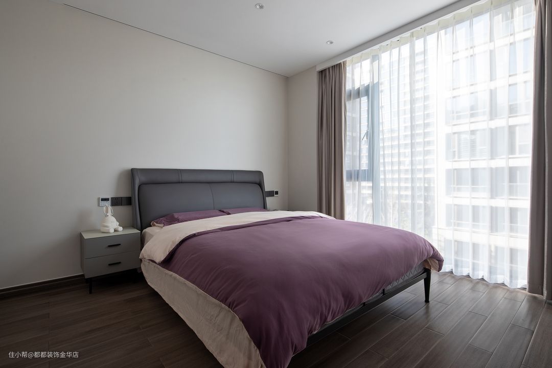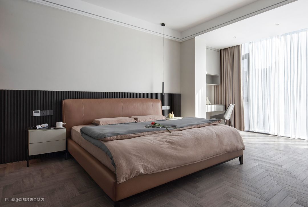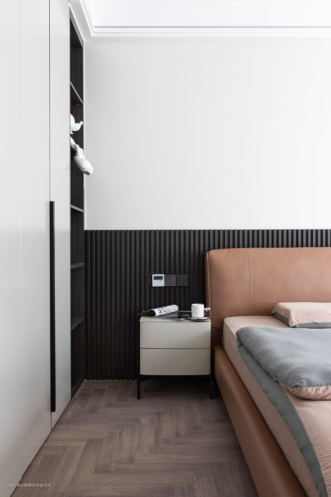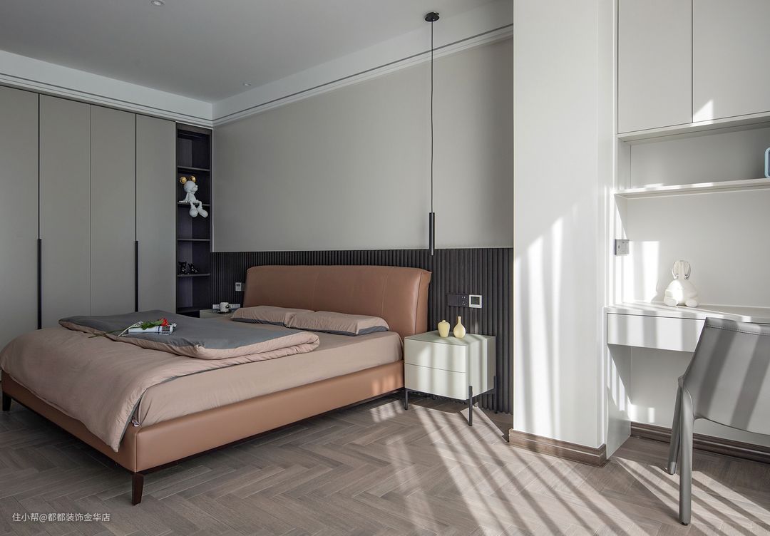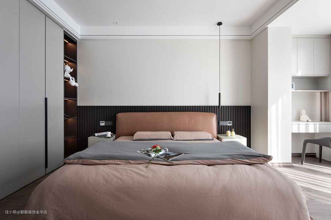 主卧延续客餐厅的简约基调,硬装以白色系为主,简单、舒适,不加过多装饰。软装选了咖色系,两种高级的中性色调进行深浅色组合,营造出一种简约、耐看的空间格调,带来了更多静谧安然的气韵。 床头背景墙采用简约白墙和黑色护墙板双拼组合,丰富层次立体质感,暖咖色软包床温柔雅致,与窗帘、床品完美相融,氤氲出自在静谧的休憩氛围。 设计师把主卧的阳台打通,使房间拥有了更好的采光和通透度。搭配浅白色书桌台,在这里看书小憩,开启宁静美好的休闲时光。 衣帽间设置在主卧内部,没有自然采光的情况难免会给人沉闷的感觉。因此在设计上,这个衣帽间使用了大面积的黑色玻璃门板。玻璃材质通透,在灯光下折射出的光芒,可以让空间更显大气,带来时尚、精致的气息。