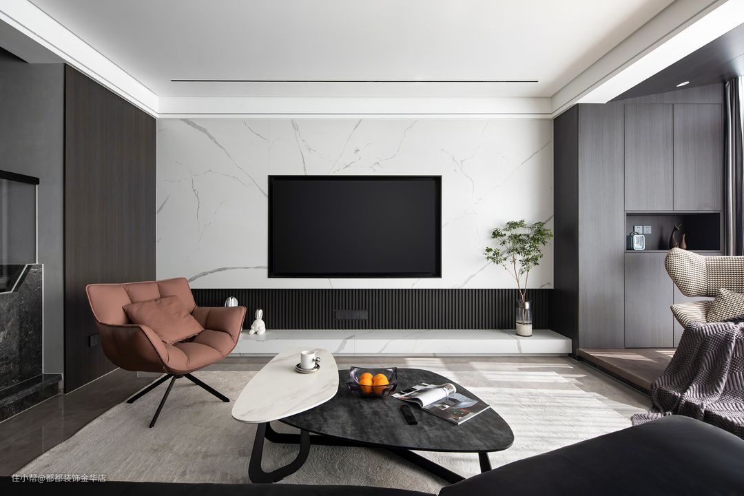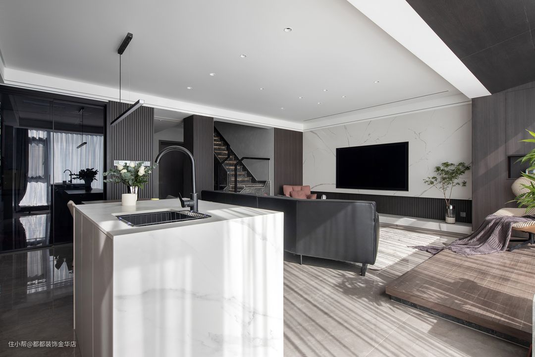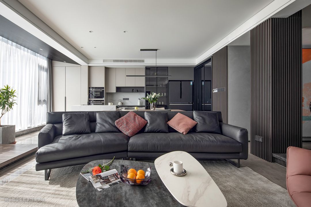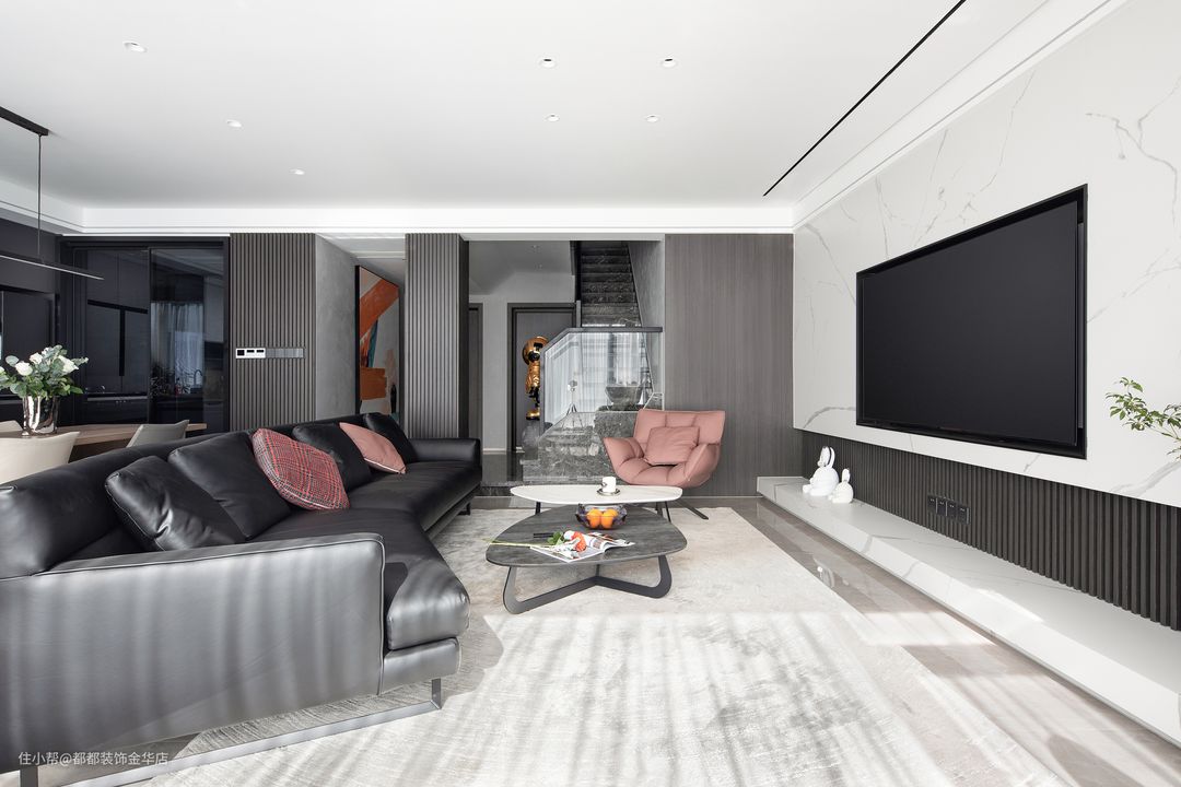 客厅的设计给人柔和沉稳的气质,木饰面和大理石,一温润一冷冽,勾勒出空间的张力和层次,整体舍弃了繁华的堆砌,节制内敛却又能打动人心,安宁的诠释出静谧的格调。 客厅软装选用皮质沙发,亮黑色经典不过时,搭配异形大理石茶几,轻松围合出简约高级的洽谈空间。 电视背景墙选用了灰白调的大理石,底部木质格栅板拼接,打造出简约但层次丰富的立体效果。 将阳台包进客厅,地面做抬高设计,在打通的阳台上放置上绿植、躺椅,规划出一个休闲区,午后阳光透过大面积的落地窗,洒入室内,用光影构建出温柔而有力的空间氛围。
