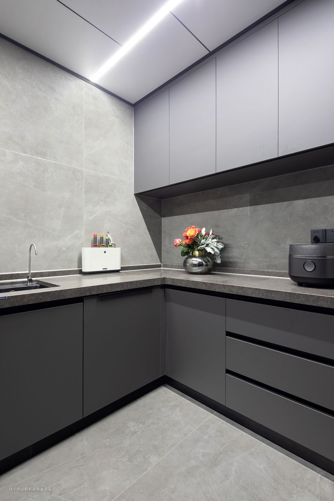 U型设计的厨房,利落的线条构成合理的动线走向。厨房整体呈灰色调,时尚大气。上下双层的柜体,带来充足的收纳空间。