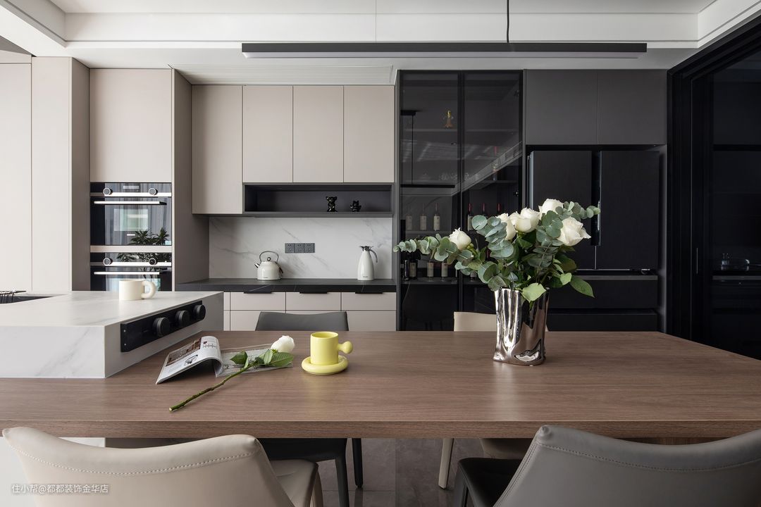 开放式餐厅格局开阔,气质高雅。自带水槽的水吧台,方便西厨操作。吧台与餐桌连为一体的设计,也使家宴聚餐变得更为便利。 通顶式储物柜满足多样化收纳需求,烤箱嵌入其中,黑色透明玻璃酒柜不仅提升了餐厅的时尚格调,也增加了储物的功能,黑白拼接的设计为空间注入一丝通透轻盈感。