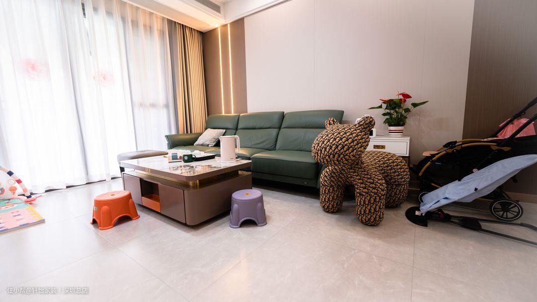 客厅的设计以白墙和白色电视柜为基调,搭配大理石花纹墙面和一张长沙发,营造出现代、高雅的氛围。阳台采光非常好,让您可以享受到充足的自然光线。大理石灰色地板的质感,让空间感觉更加通透和自然。 墨绿色的长沙发作为客厅的主要家具,不仅提供了舒适的休憩空间,还展示了现代时尚的设计。沙发的皮材质和颜色,为客厅带来一种自然和亲切,大雅的氛围,同时也增加了整个客厅的流畅感。 一个艺术性的櫈椅增加空间的艺术性。 一字型电视柜简单雅致,十分整洁美观,同时大理石背景墙周围嵌入灯带,氛围感十足。