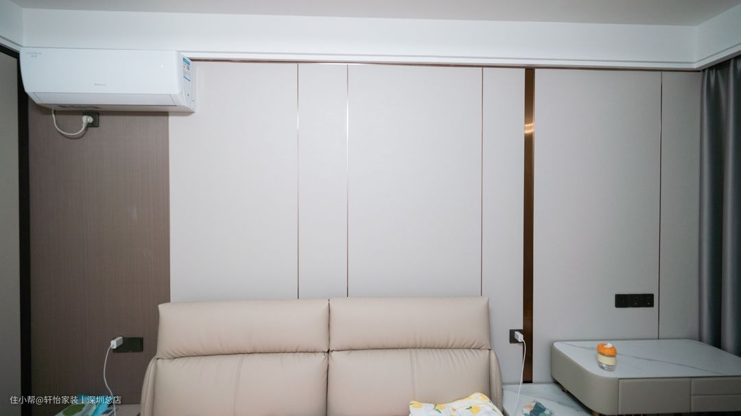 浅浅的米白色和原木色作为背景墙的颜色。搭配粉色的床品进行点缀,为了增加房间的层次感和视觉效果,使用了皮质的米白色的背饰板来连接双床头柜。这种设计不仅提供了储物空间,背饰板的选择与主色调相呼应,使房间的装饰更加协调统一。 金色的线条增加空间的雅致大气的气质。 床头处设计精巧的悬空抽屉式收纳柜,节省了房间的地面面积,采用了独特的悬空设计,台面用作了梳妆台,其台面宽敞,足以摆放各式各样的梳妆用品, 主卧是长型衣柜,选择了隐形的推拉柜门,可以一目了然地看到衣物的摆放和整理。门的颜色与空间的主题呼应,衣柜内部合理地划分了不同的空间,以便更好地组织和存放衣物、鞋子和配饰等物品。柜子内部配备了可调节的衣架、抽屉和储物盒等功能,可以轻松找到所需。