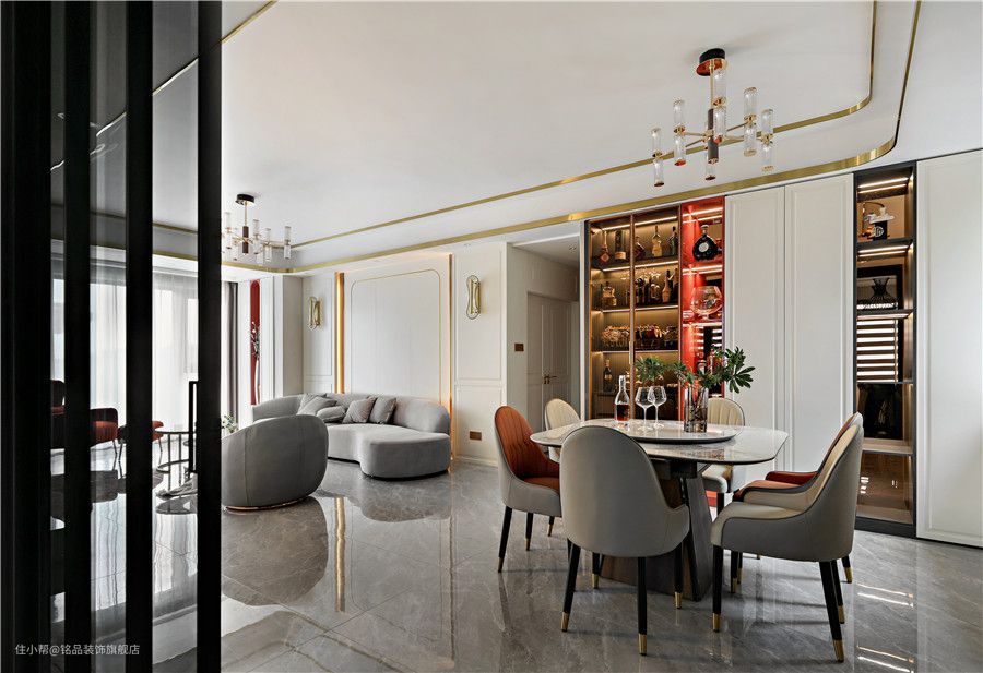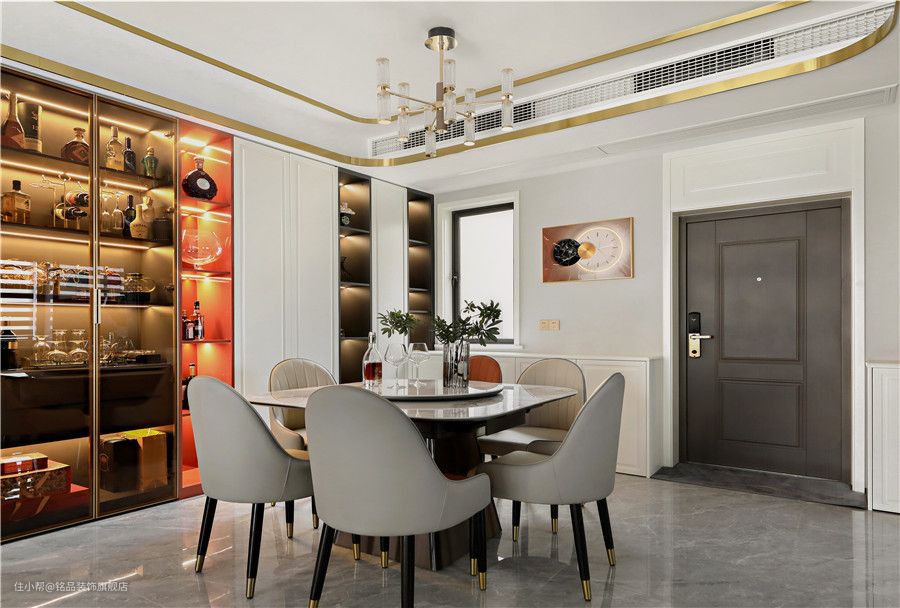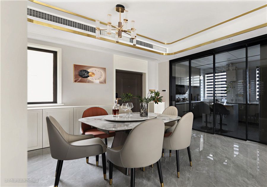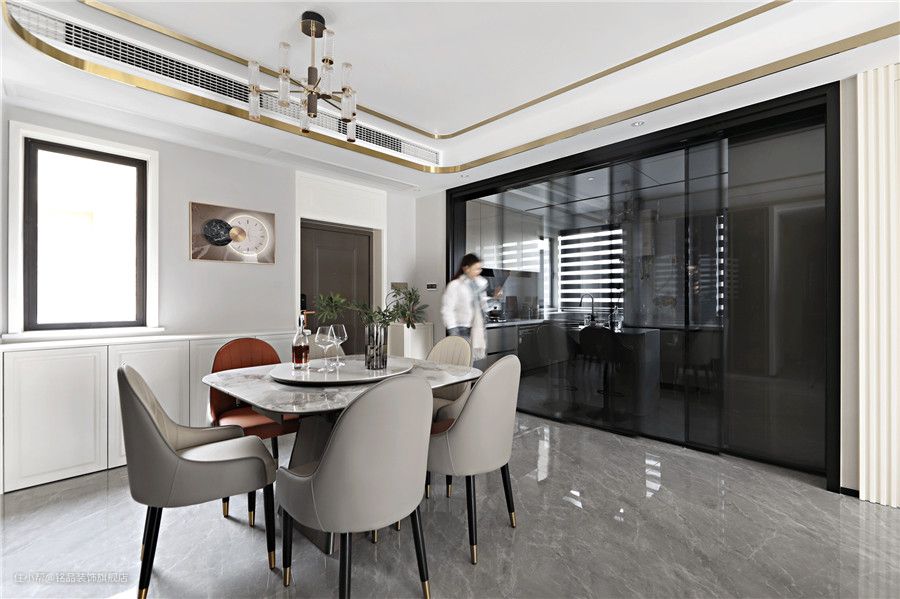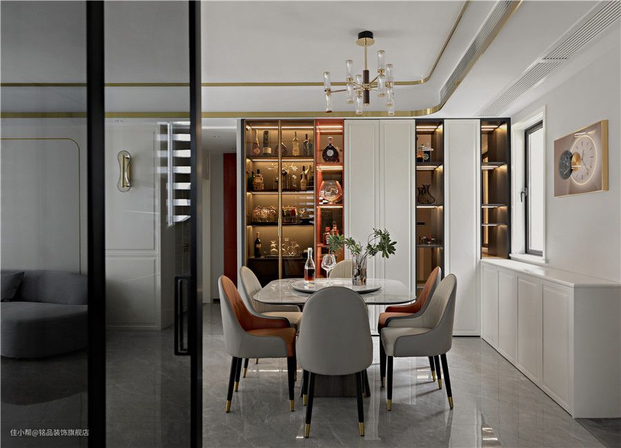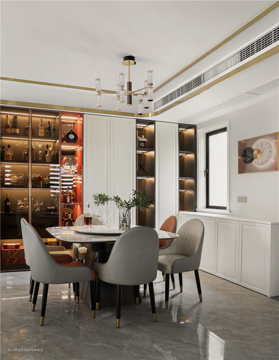 餐厅因为与客厅相通,所以采光也是极其充沛的,开阔的视野与丰富的采光将餐厅效果整体释放出来~四周定制餐边柜半藏半露的格式,美观效果满分。玻璃柜体做酒柜摆放珍藏的酒品或高脚杯,在柜内灯带照明下衬托出极好的轻奢质感~ 餐桌与餐椅从色系到材质上都有一定的关联,相互过渡。皮质餐椅搭配方形餐桌,显得个性与众不同。餐桌四周弧形设计避免磕磕碰碰容易撞伤,中间圆托盘方便家人夹菜