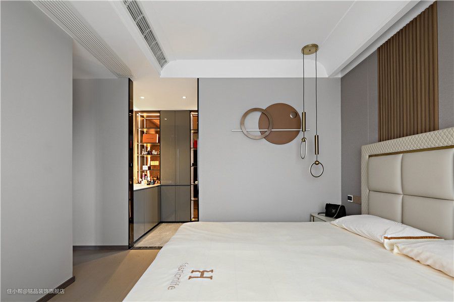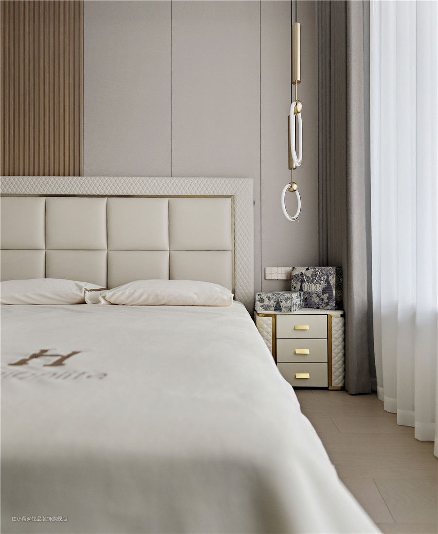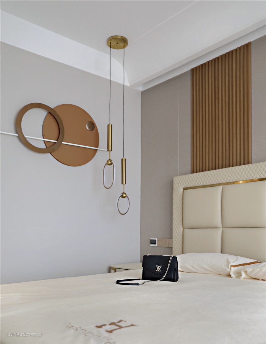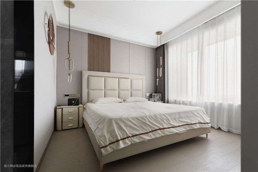卧室内的空间没有过多的造型,背景采用木饰面硬包板材质铺贴,搭配少许木格栅造型点缀下,更好的增添了层次感。定制的床品,皮革靠背让整个空间显得更柔和舒适,两侧金属吊灯的呼应下,可以说轻奢质感满分了~ 三层抽屉收纳的皮革床头柜与床品风格也是相呼应的,在原木地板的衬托下卧室更显得柔和静谧又不乏高级感。全景大窗户给卧室提供了充足的采光,这样氛围的空间怎能不让人心动呢?