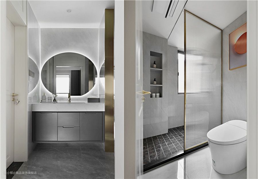 二式分离设计,干区布置在类似过道区,提升了实用灵活性和使用价值。壁挂式浴室柜防止木质受潮,柜体带有储物性满足了基础的收纳需求。圆形浴室镜周边安装灯带,提升美观性的同时又满足了光线 私区布置了淋浴房和马桶,淋浴区内墙上挖了几道壁龛,摆放沐浴用品之类的使用拿取便利。地面铺贴防滑地砖,为洗浴安全做保驾护航~淋浴房长虹玻璃➕金属框的隔断,不会影响其它空间的采光,又给卫浴营造出一种朦胧美的效果 #