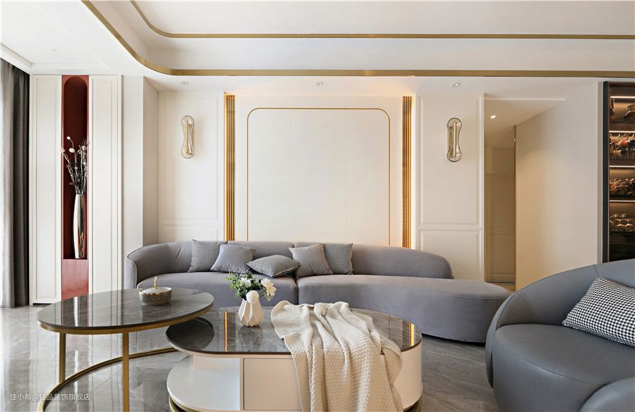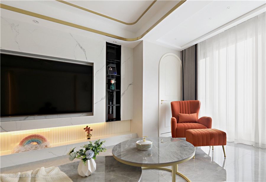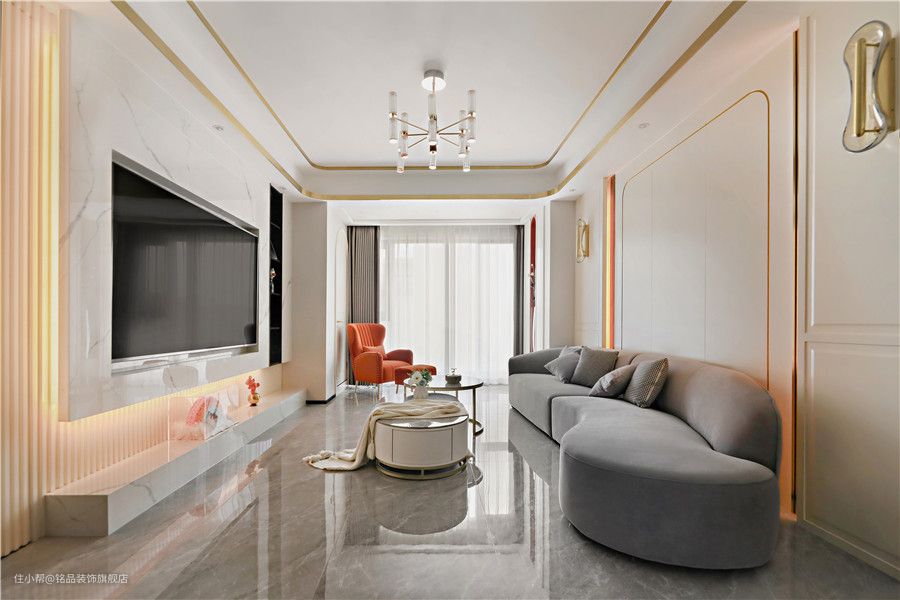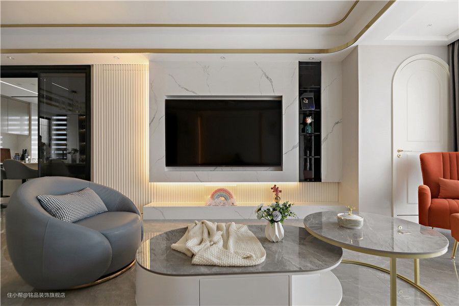 客厅与阳台打通之后,整个空间瞬间变得开阔明亮了,采光条件也更上一层楼。在做电视别精巧的时候,原本考虑想要用护墙板贴木饰面,但考虑到整体的效果改用大理石上墙铺贴,更复杂的工艺也侧面反衬出了设计的魅力。 电视墙半悬浮设计并在悬浮区周边加了道隐形灯带照明,显得温柔又美好,成为空间的一大亮点。十公分左右地台更是在视觉上带来极好的层次感。 考虑到电视墙的收纳问题下,我们又在靠阳台一侧挖了道陈列柜,满足收纳的同时又提高了局部空间的灵动性 整个沙发背景墙采用奶油系的画风,温柔可人让人一眼望去便沉浸于此。墙面细石膏线勾勒出层层视觉效果,左右对称式布局各有一道嵌入式木格栅和壁灯点缀下,整体和谐标致~ 搭配背景墙造型对于沙发软装选的是低饱和度的浅灰色系,不规则沙发、茶几款式符合年轻人的居家审美 客餐间过道,可以说是完全按照效果图方案进行一比一还原,红色的背景可以说也是室内一道点睛之笔,成功链接了各个区域