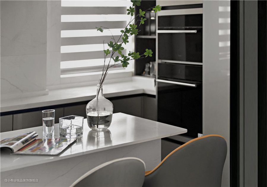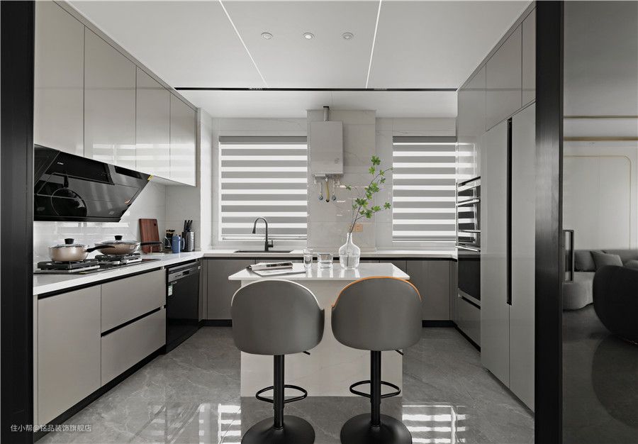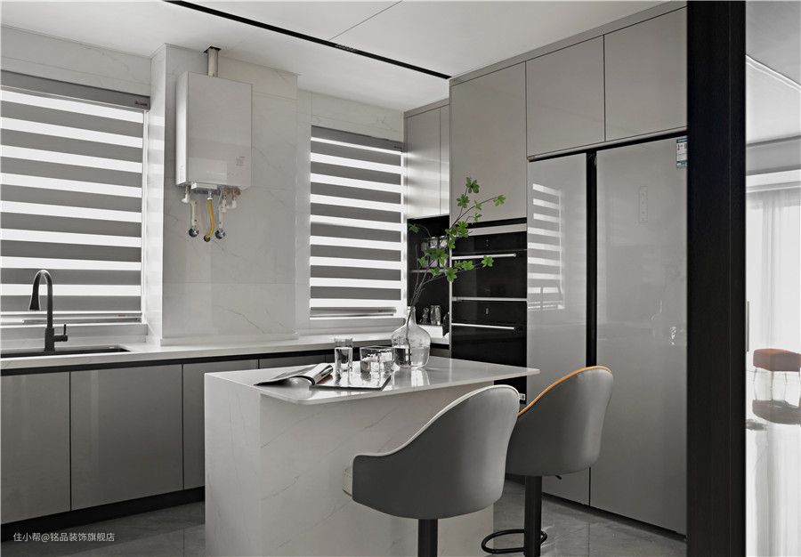 餐厅对面的玻璃门内就是厨房了,玻璃推拉门的形式打造出了半开放式的下厨环境。既有开放式厨房的宽敞感,又有明确的区域划分不怕油烟到处乱窜 U型动线布局让下厨环境尽可能的宽敞舒适,中间位置布置岛台可作为平时咖啡岛台,或者下厨的时候家人打下手择菜,或者作为临时盛菜区,功能多多~